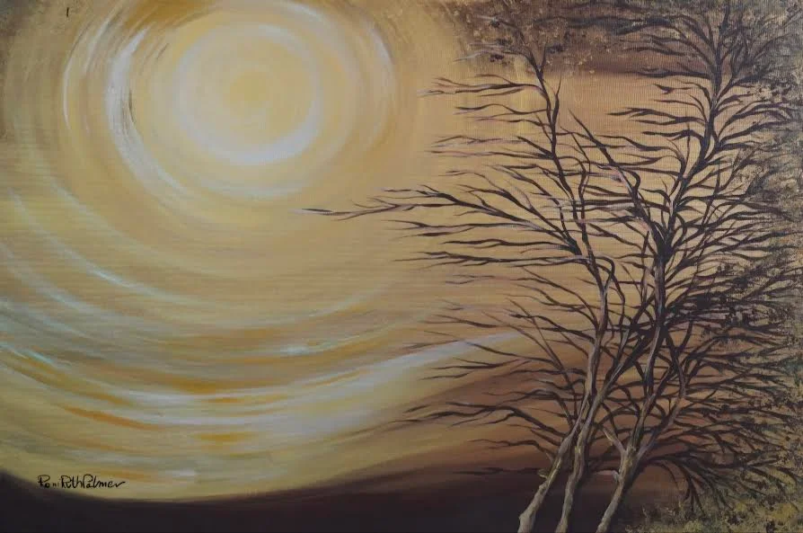 Original painting of a golden sunset, with golden hues, sun, mountains and bare trees that blend with the movement of the sun