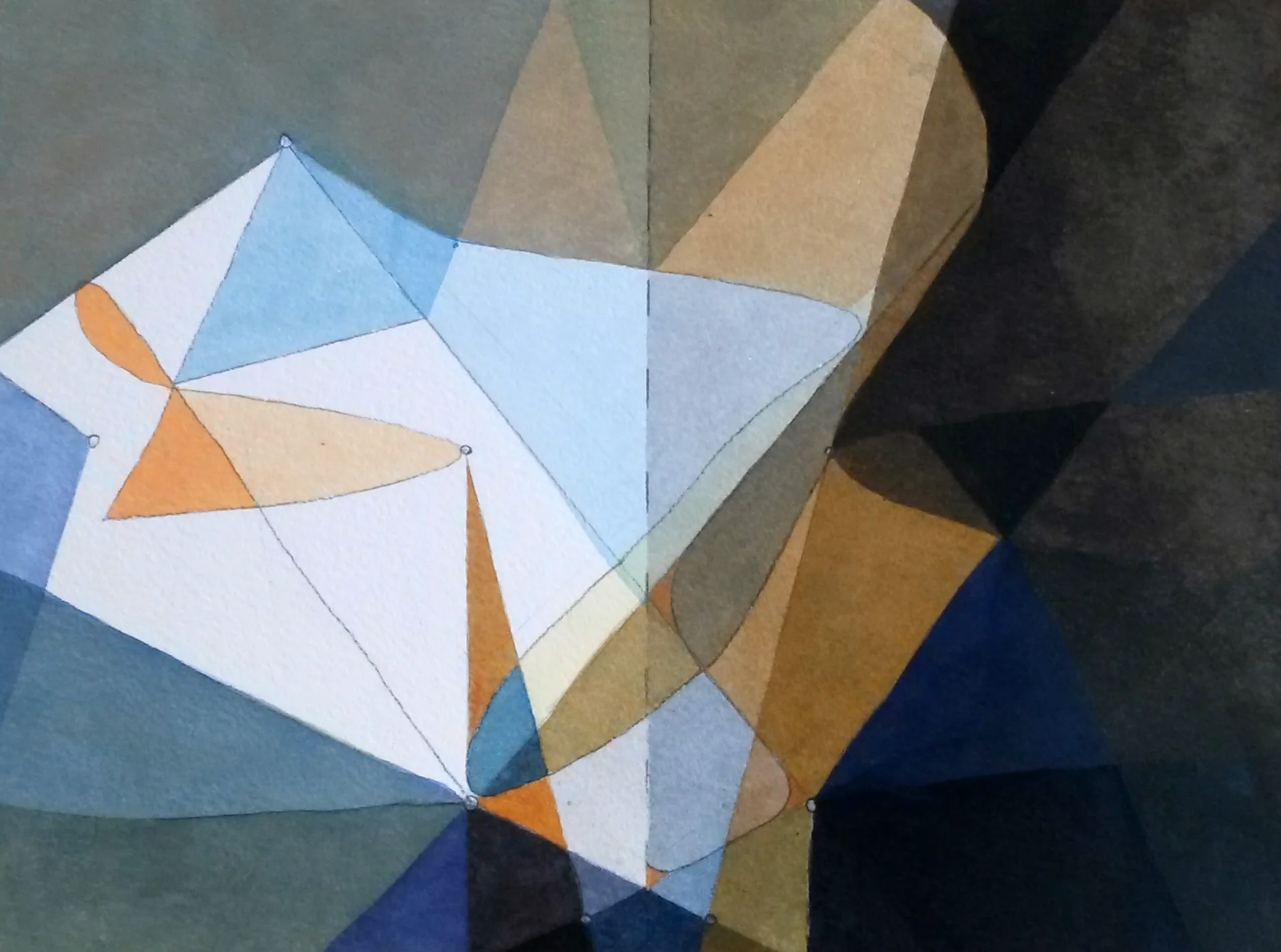 A geometric abstract composition, unfolding through layered planes of light and darkness. Soft blues, warm golds, and deep dark tones create a visual dialogue between warmth and cold, movement and stillness. 2015