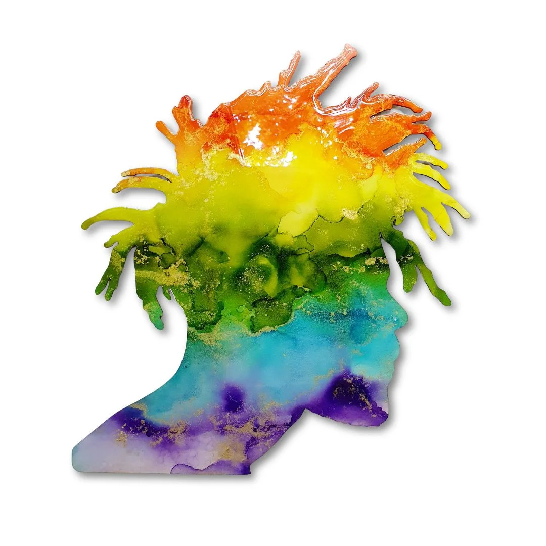 A modern wood-based artwork shaped in a cool dreadlock silhouette, glowing with full-spectrum color. It merges street style with artistic flair โ a celebration of individuality and colorful expression. Please note: the piece is made from thin wood and should be handled gently, as it may break if dropped.
