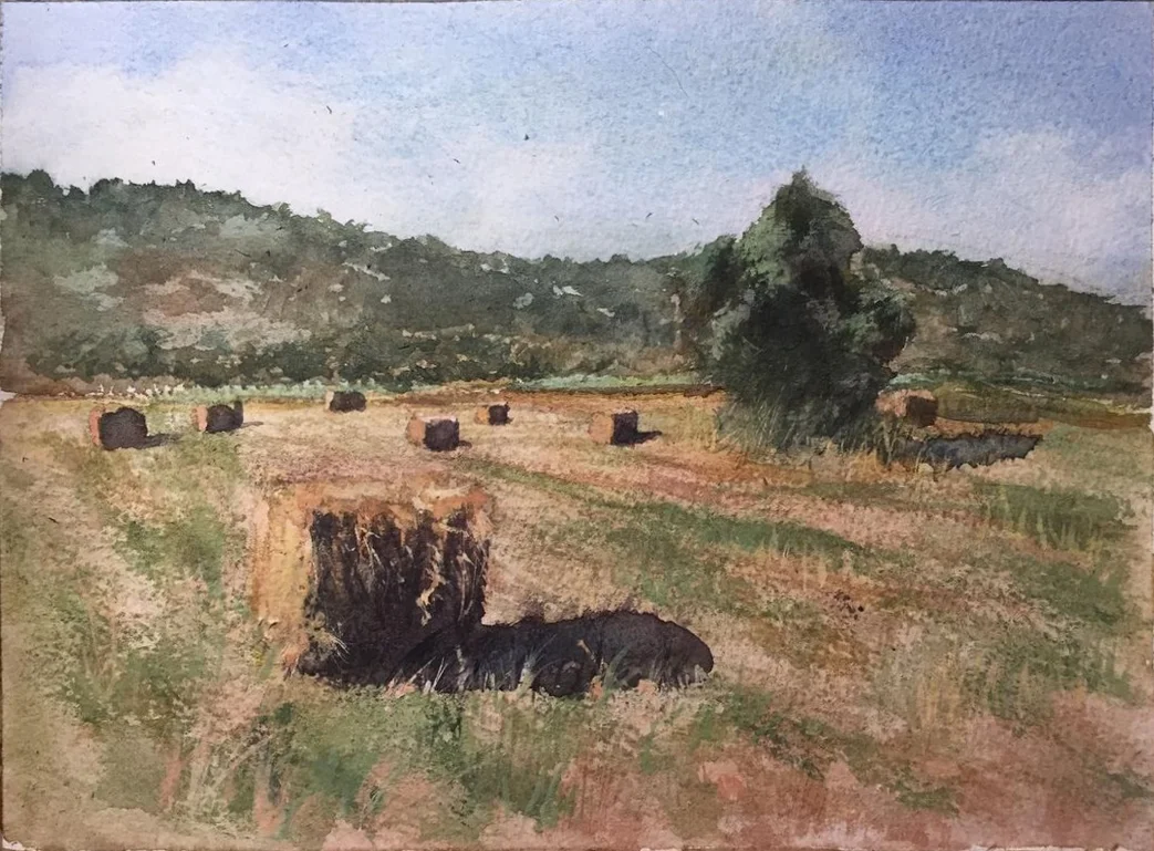 A watercolor landscape of harvested hay bales scattered across a rust-colored field with green vegetation, forested hills rising in the background, and a pale blue sky above.