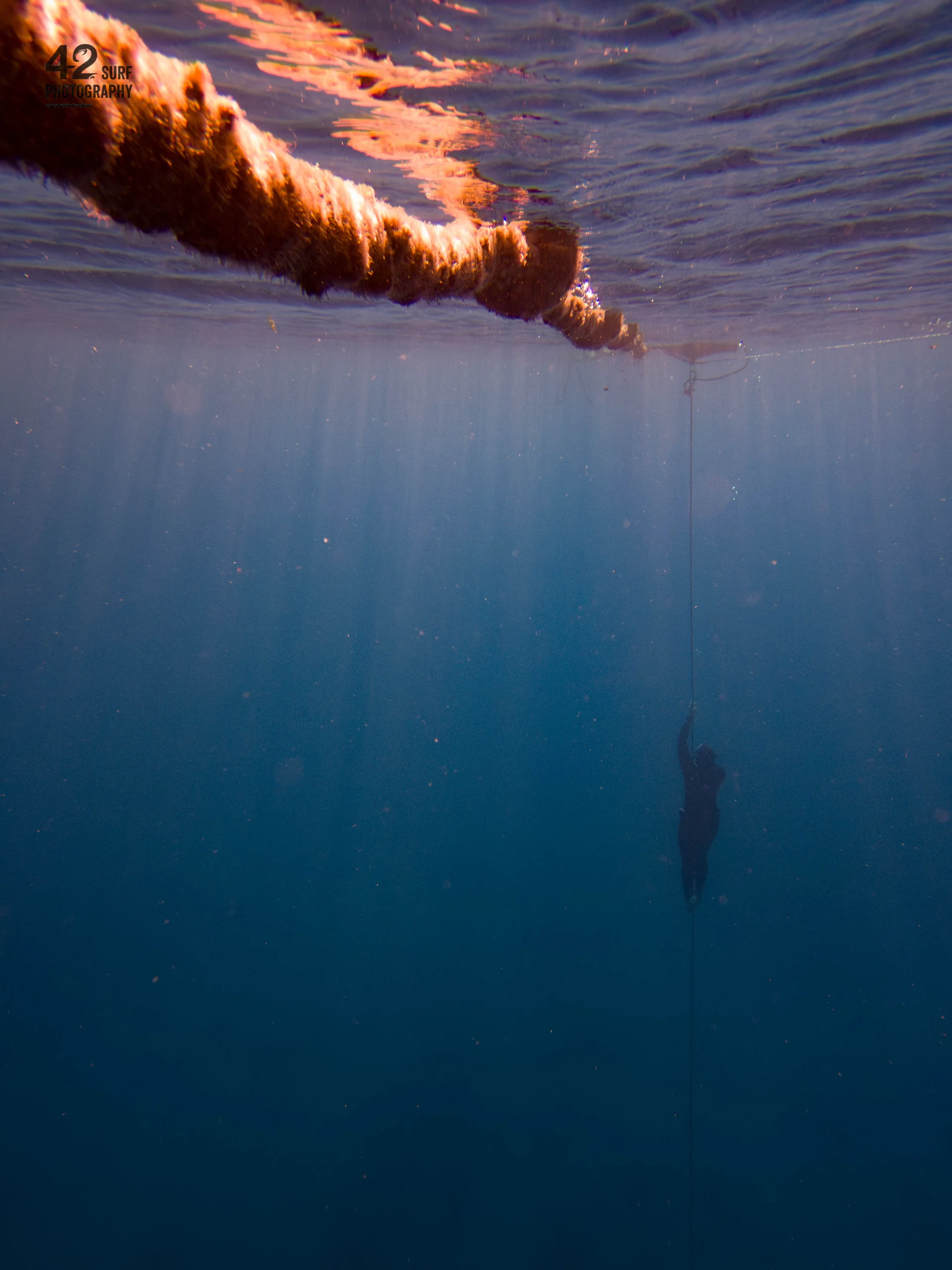In the deep blue, suspended between a sunlit surface and an endless abyss, a solitary figure holds onto a thin line descending from light into darkness. The rope becomes a vertical axis of connection—between above and below, between breath and no-breath, between safety and surrender. The golden trail shimmering across the surface stands in sharp contrast to the profound stillness beneath. Above—movement, color, and life. Below—silence, focus, and inward gathering. The figure hangs between worlds, holding the line not only as a physical anchor, but as a symbol of the choice to remain connected, precise, and present. Hold the Line reflects on the delicate tension between control and release. It invites the viewer to ask: which line do you choose to hold when everything around you is in motion?