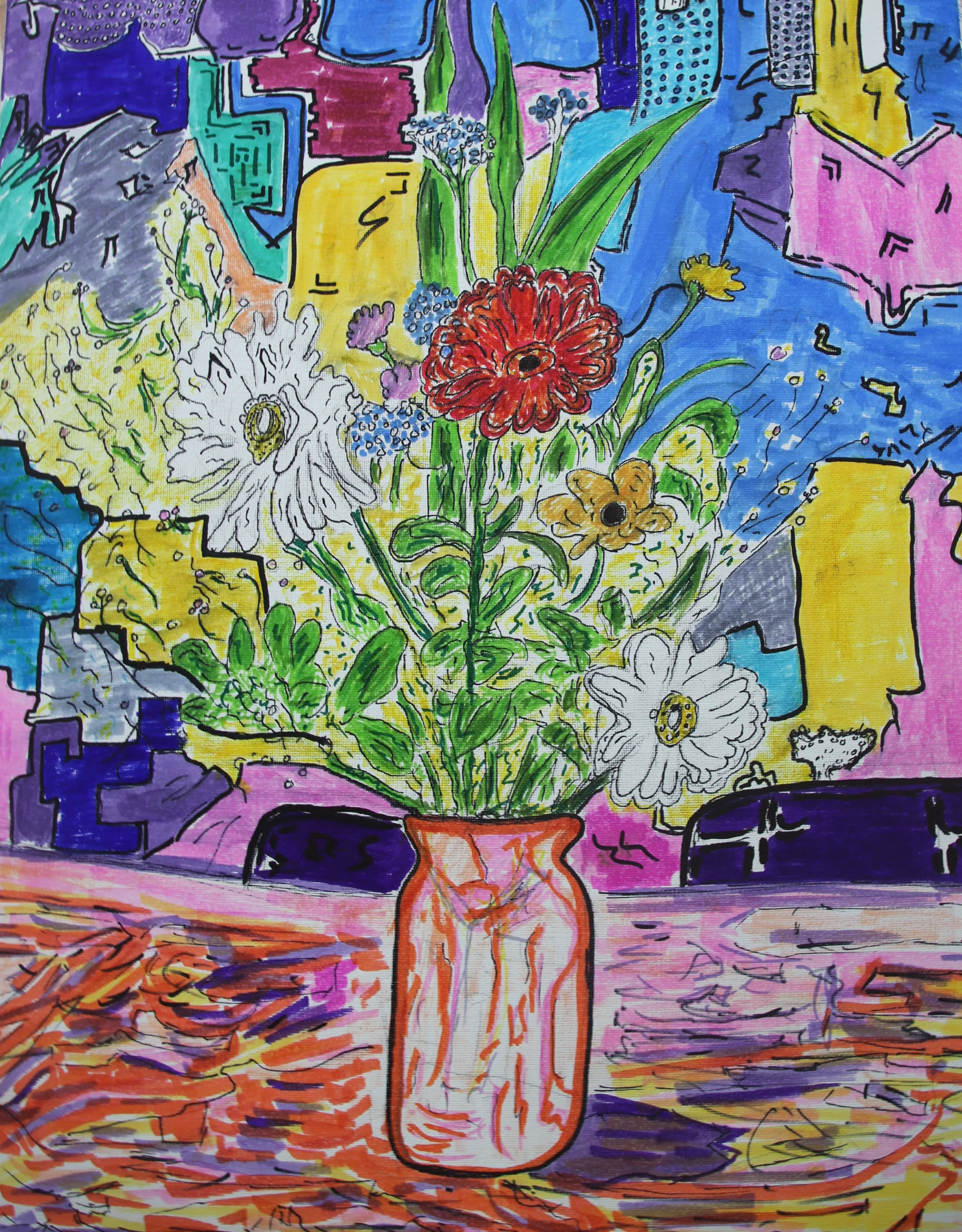 Artist: Daniel Avraham Hadad Medium: Mixed Media on Canvas Dimensions: 50 cm x 40 cm About the Artwork: In this piece, Daniel Avraham Hadad transforms a domestic holiday moment into an expressive visual celebration. Born from a spontaneous interaction with a festive bouquet, the result is a vibrant Still Life set against a dynamic, abstract backdrop. The work captures the essence of spring, renewal, and the joyful spirit of the holiday season. Artistic Highlights: Color Language & Organized Chaos: The use of bold, saturated colors creates an immediate festive atmosphere. The background is a mosaic of geometric and abstract shapes, providing the central flowers with a striking modern presence. Technique: The contrast between the precise black outlines and the free-flowing color strokes on the canvas is compelling. The rhythmic brushwork at the base suggests movement, making the bouquet feel "alive" within the space.