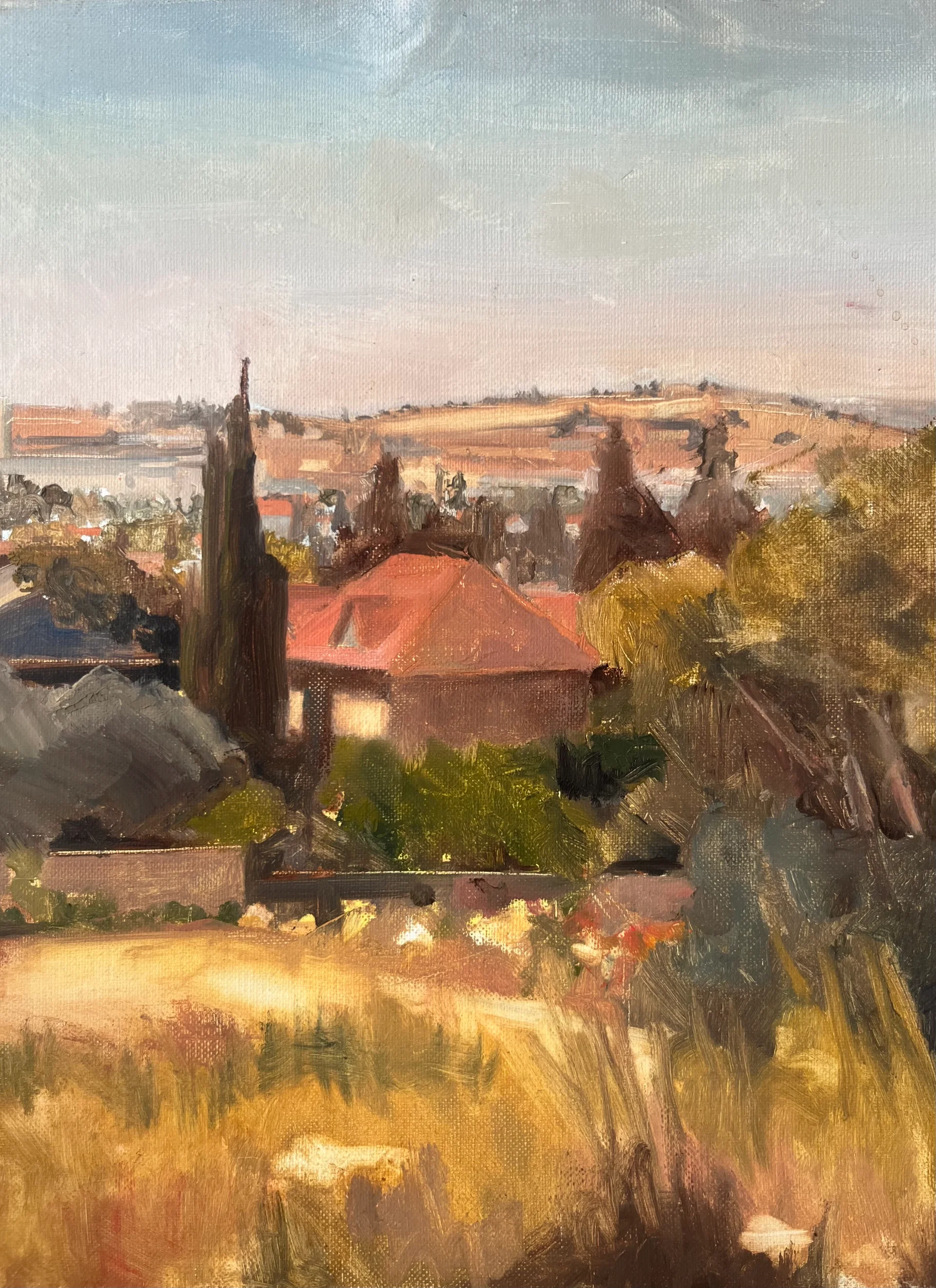 A landscape painting of a house with a classic red roof set against the Jerusalem hills.