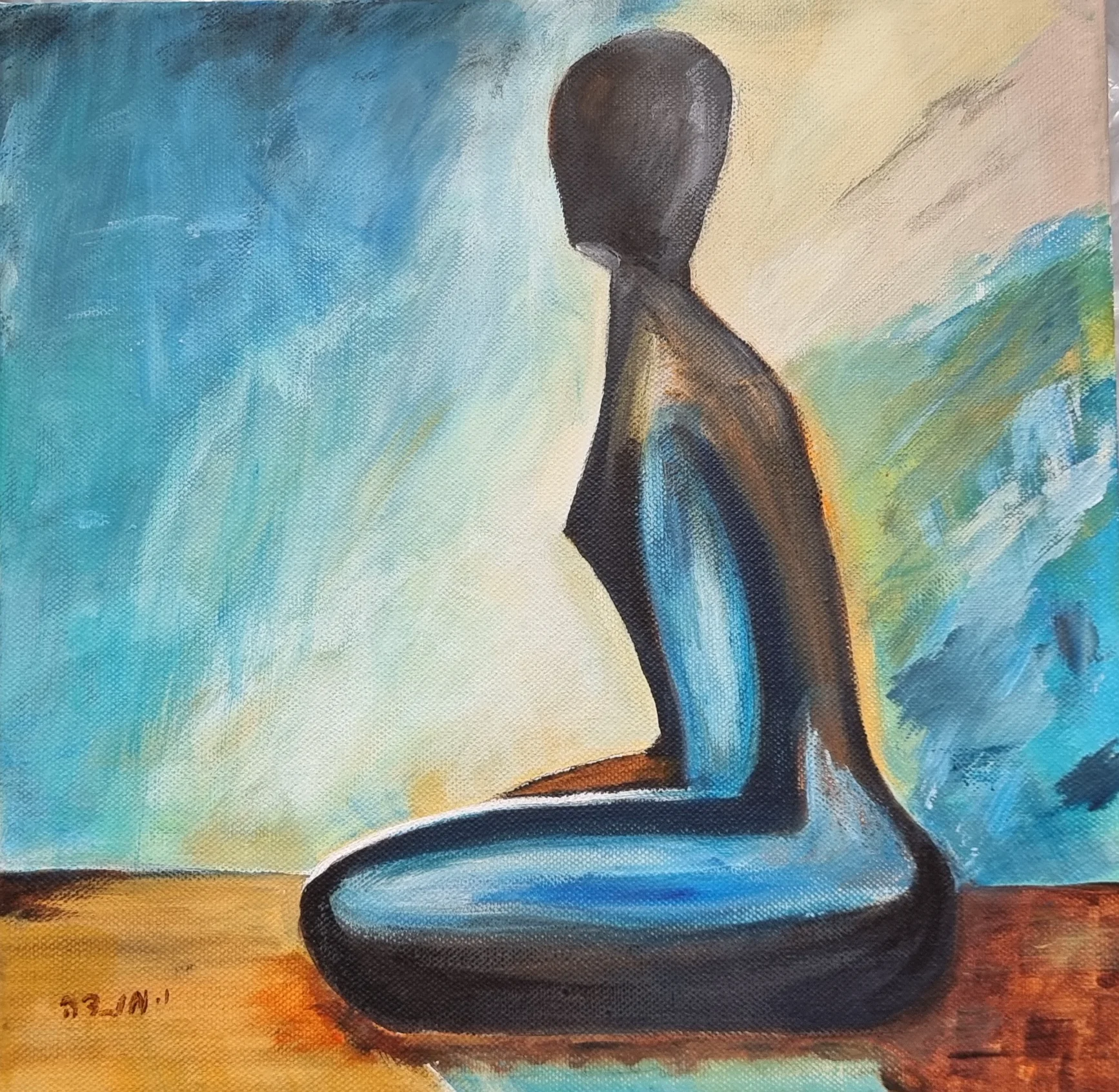 Acrylic painting on canvas, the figure is featureless, shifting the focus from the persona to the emotion and state of mind. The curved lines and flow of the figure create a sense of harmony and tranquility. The texture of the canvas and expressive brushstrokes are clearly visible, giving the painting a modern character and a sense of lively handwork.