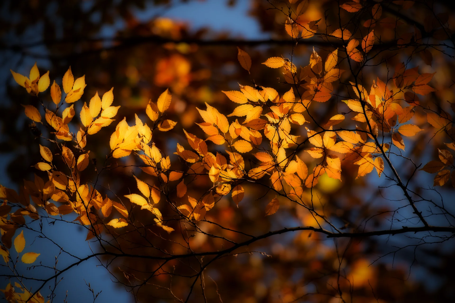 A luminous photographic study of autumn foliage, capturing golden leaves suspended against a softly blurred background. Printed on paper, the work emphasizes warm seasonal light, delicate branch lines, and a calm, poetic atmosphere inspired by Japanese aesthetics.
