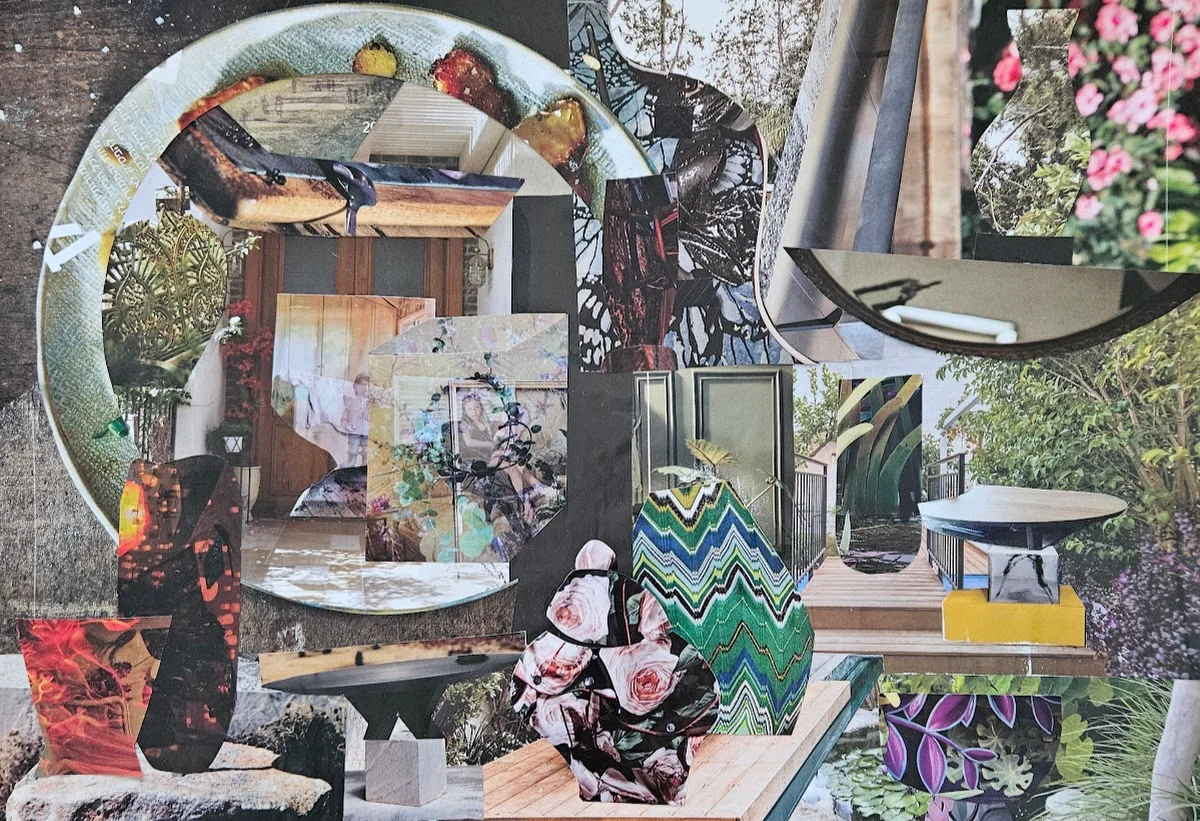 The collage is made from magazine clippings. It consists of many pieces. It is harmonious and contains several vases in different shapes.