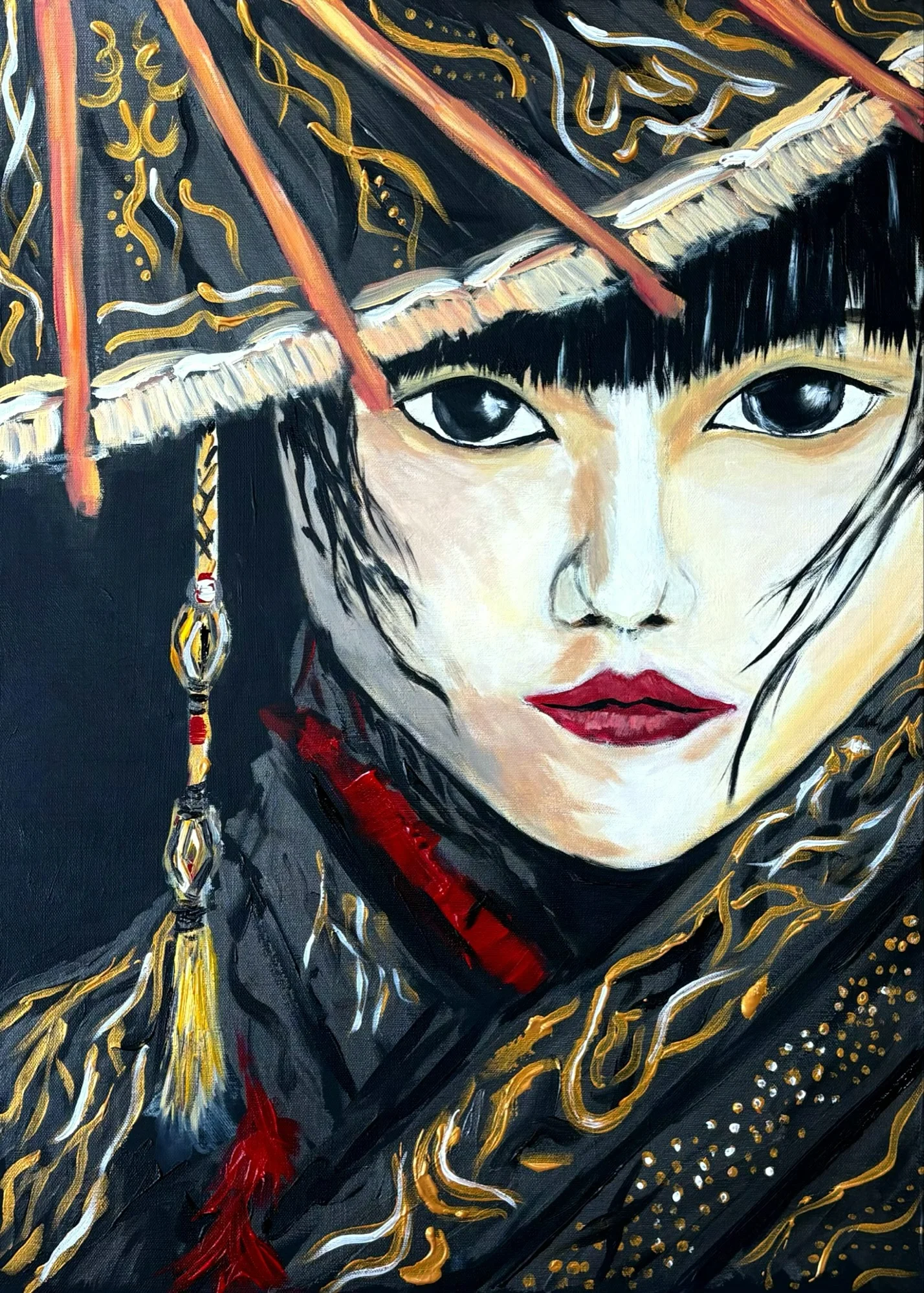 This painting was created out of my curiosity about Japanese culture. It shows a Japanese woman in traditional dress, focusing on her powerful expression and the colorful details of her clothing. Using my palette knife technique, I wanted to bring the beauty of this culture to life on the canvas.