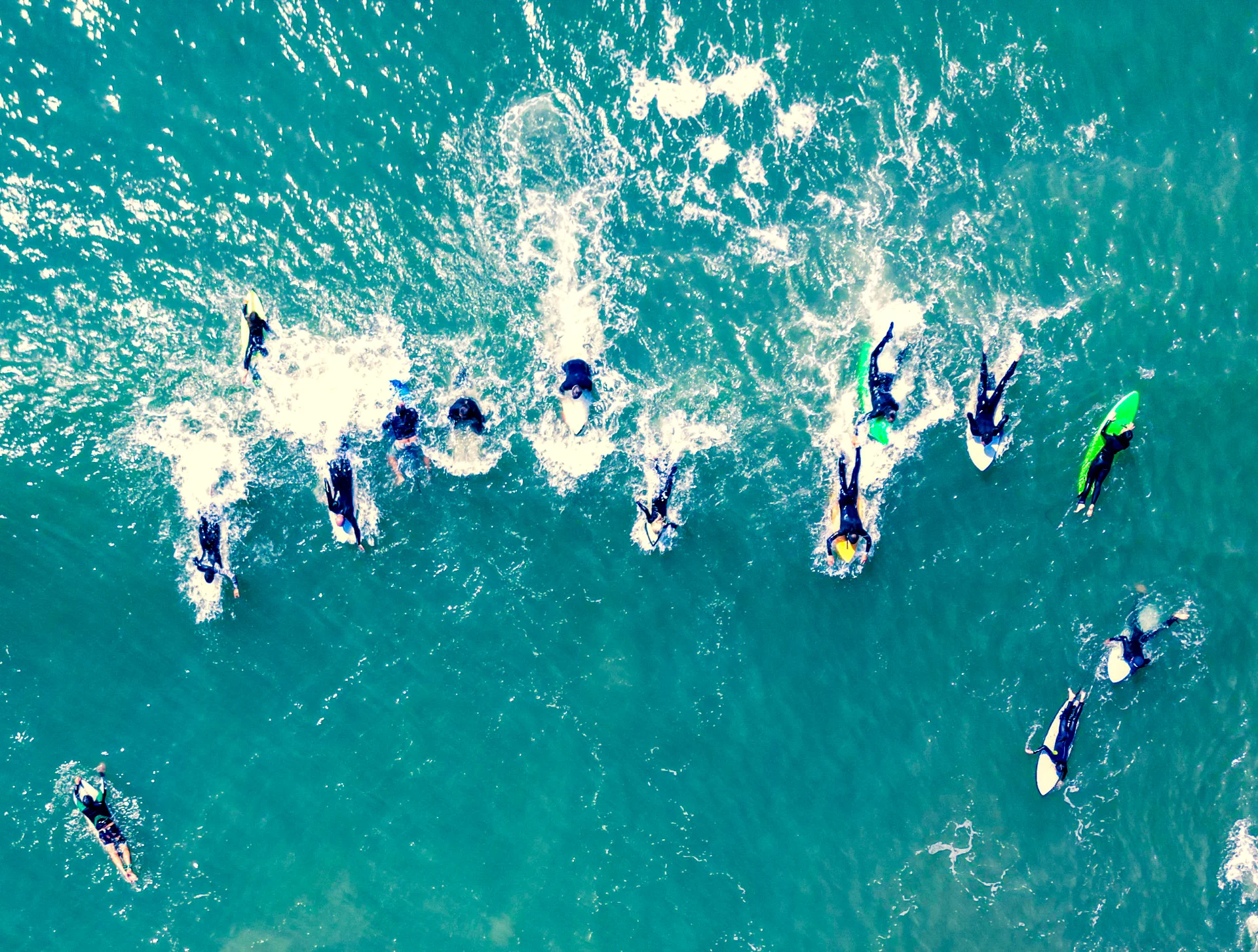 A dramatic aerial view above the turquoise sea reveals a group of surfers spread in an almost straight line, just before the wave breaks. They lie on their surfboards, paddling forward together, as white foam scatters around them, creating motion and visual rhythm. The symmetrical composition and the spacing between them emphasize a shared moment of launch, like a starting line in the heart of the open water. The soft light and cool color palette give the image a clean, dynamic, and liberating atmosphere.