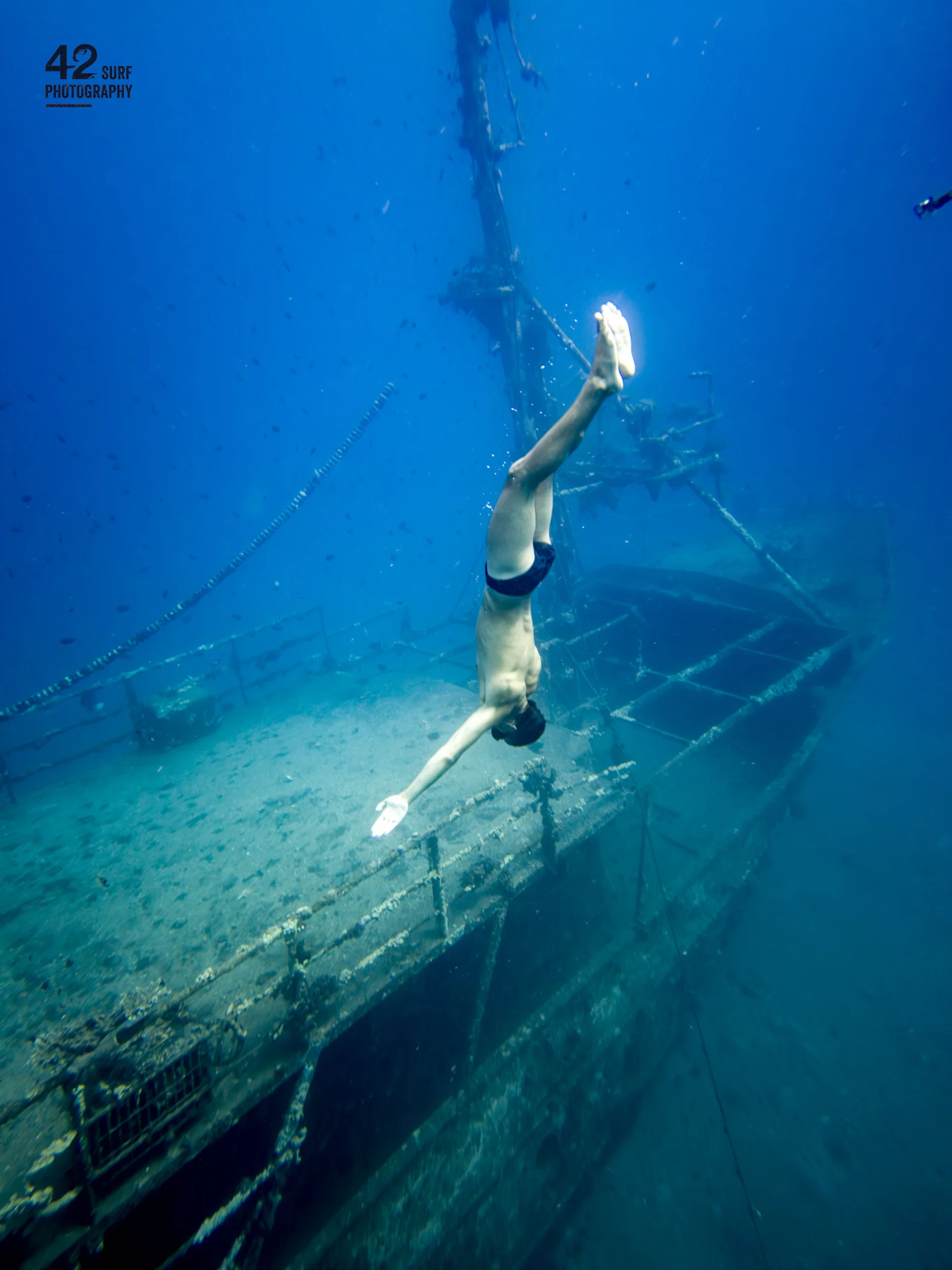 An invisible line separates between worlds โ between light filtered through blue water and the soft darkness of the deep. In a moment of complete surrender, the freediver descends along the hull of a sunken ship, arms spread like wings, body drawn taut like a released arrow. The photograph captures the tension between movement and stillness, between the strength required to swim and the absolute silence of the surrounding sea. The ancient metal skeleton โ heavy with history and years of sinking โ serves as backdrop to the aliveness of the moment, to the single breath held before diving into the unknown. "Let It Be" invites the viewer to descend inward โ to that place where we stop holding on and begin to let go.