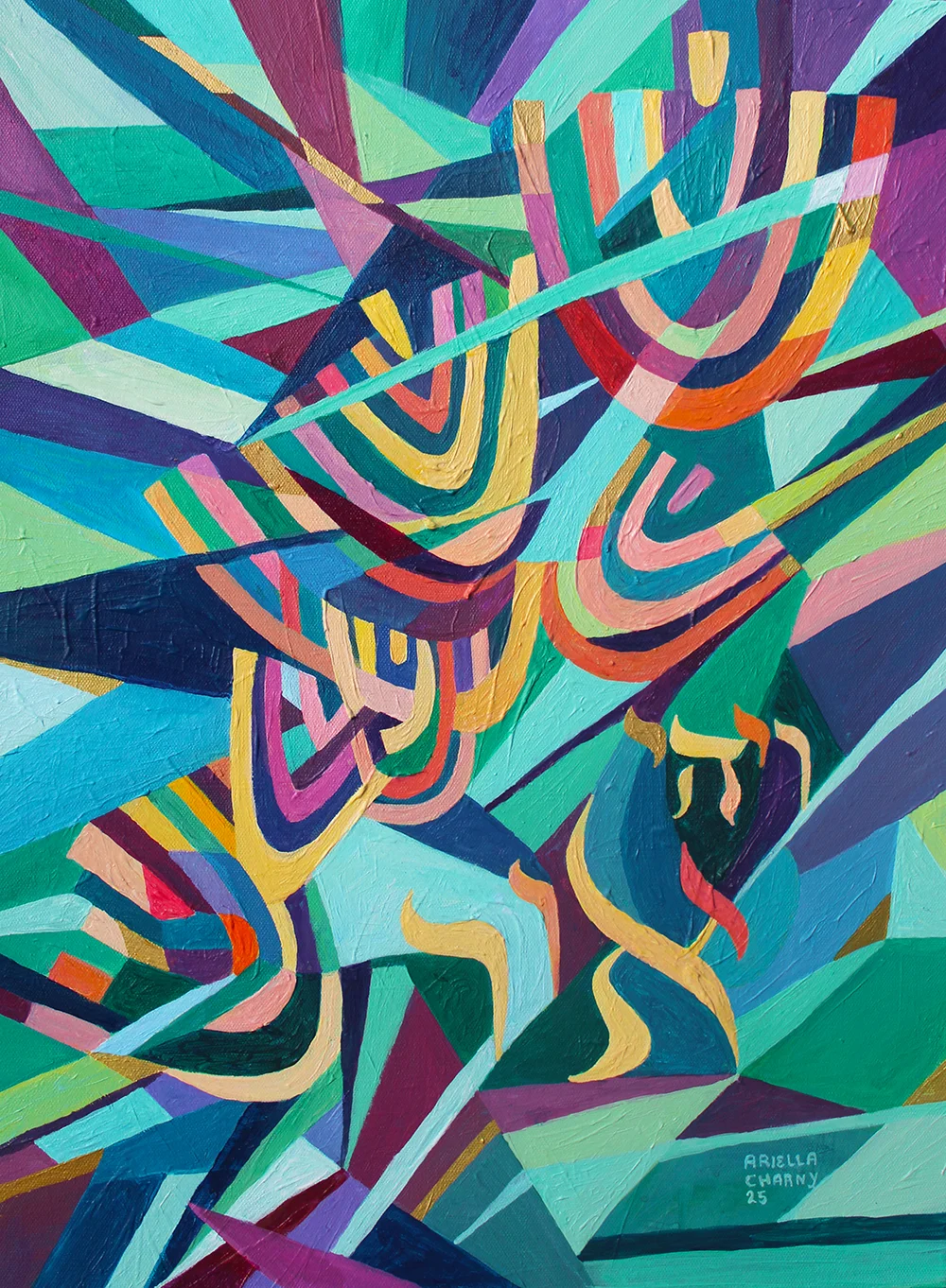 Contemporary interpretation of the idea of bringing light into the world, with the famous words from the Bible, Genesis, "May there be light," or in Hebrew, "ืืืืื ืืืจ." These words are surrounded by a kaleidoscope of radiating light and color, and the most ancient and iconic of Jewish symbols, the Menorah, or 7 light candelabra.