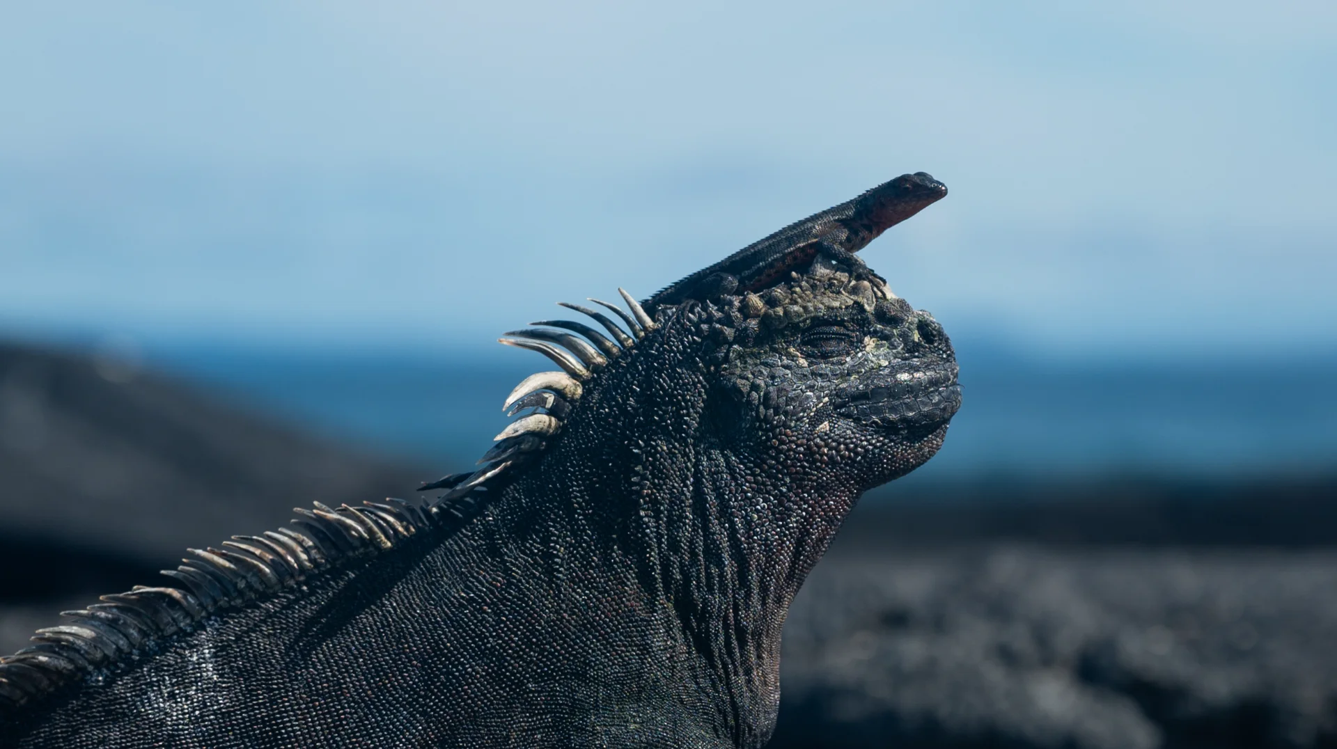 A lava lizard basking in the sun on top of another lizard (a marine iguana), photographed on Fernandina Island in the Galápagos, Ecuador