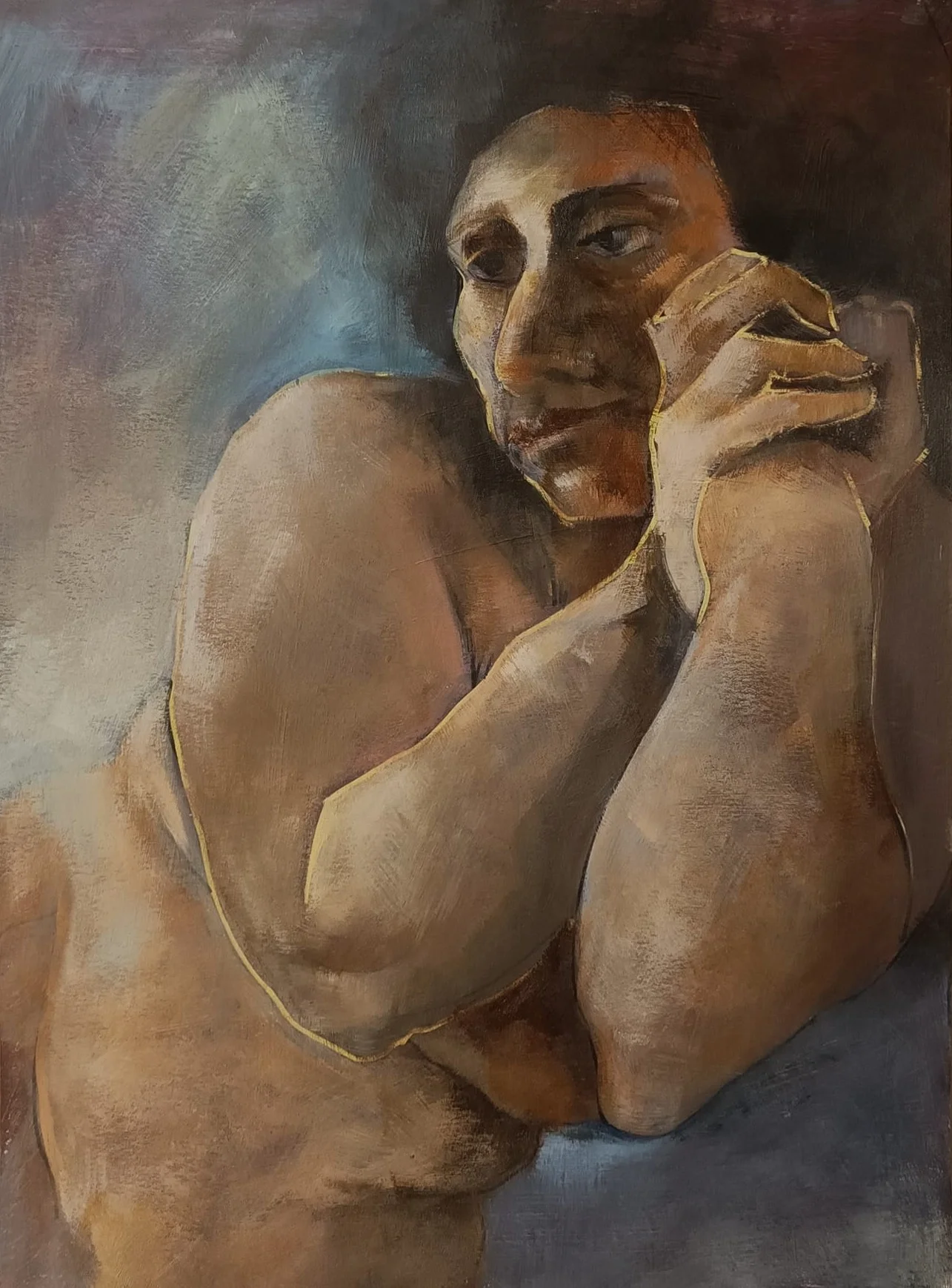 A nude woman is presented in a waist-up portrait. Her clasped arms express tension and inner sorrow. The gaze, directed to the side, avoids direct contact with the viewer and encloses the image within a space of personal experience. The figure exists not as a narrative or action, but as a state โ compressed, unresolved, without escape. Emotion is not displayed but held, transforming into a dense, almost tangible presence.