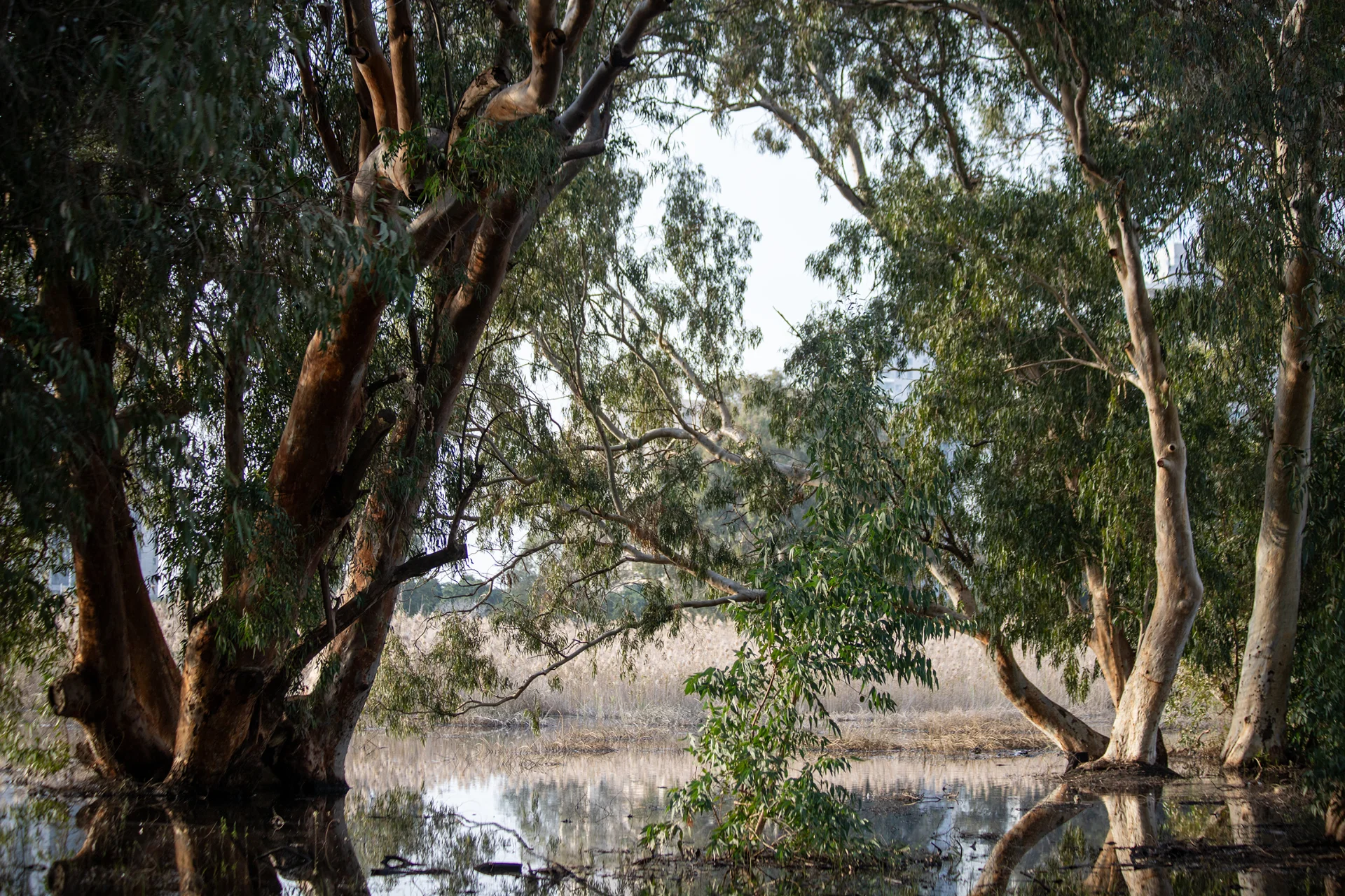 In the center of the image stands a majestic ancient tree with a twisted trunk, its roots firmly gripping the moss-covered riverbank. The tree is in a state of spectacular autumn foliage, its leaves painted in vibrant shades of orange, red, and gold At the foot of the tree flows a crystal-clear stream, bubbling between rounded river stones. The water creates small white ripples and tiny cascades as it flows toward the viewer