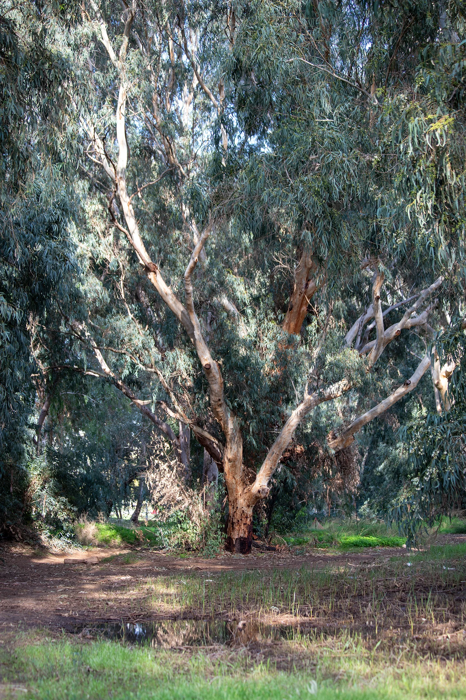 In the center of the image stands a majestic ancient tree with a twisted trunk, its roots firmly gripping the moss-covered riverbank. The tree is in a state of spectacular autumn foliage, its leaves painted in vibrant shades of orange, red, and gold At the foot of the tree flows a crystal-clear stream, bubbling between rounded river stones. The water creates small white ripples and tiny cascades as it flows toward the viewer