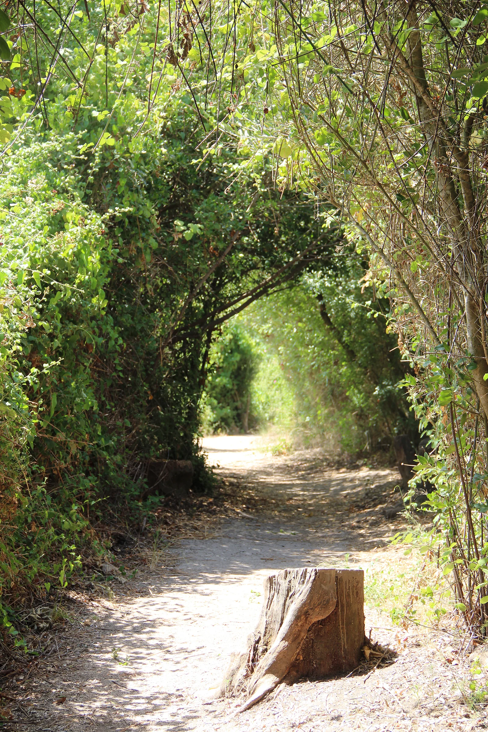 The image features a shaded dirt path passing beneath a natural "tunnel" formed by dense, leafy green tree branches. In the foreground, a prominent tree stump adds an element of storytelling and the passage of time to the pastoral landscape. Sunlight streams in from the end of the tunnel, creating a bright focal point that draws the eye forward, while the interplay of light and shadow on the ground gives the scene depth and a sense of a peaceful stroll through the heart of the woods.