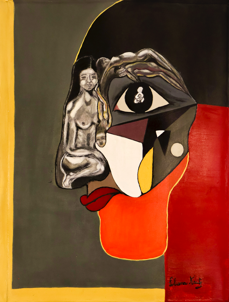 charcoal, synthetic and paste A surrealist portrait of a human face composed of geometric shapes and intense colors. The artwork explores the human being as a universe in constant change. Its elements reflect cycles of life, thought, and love. It invites introspection, as if whispering: “All that we are is in constant metamorphosis, even when we believe ourselves complete