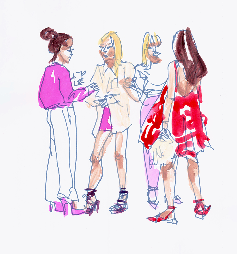 A light, feminine illustration capturing four figures sharing a brief street conversation in soft pink and red tones