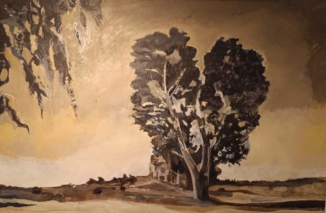 An Og eucalyptus tree stands in an open landscape, its branches moving gently in the wind as daylight washes the leaves in soft greens. The restrained scenery emphasizes a quiet presence, connecting earth, sky, and time.