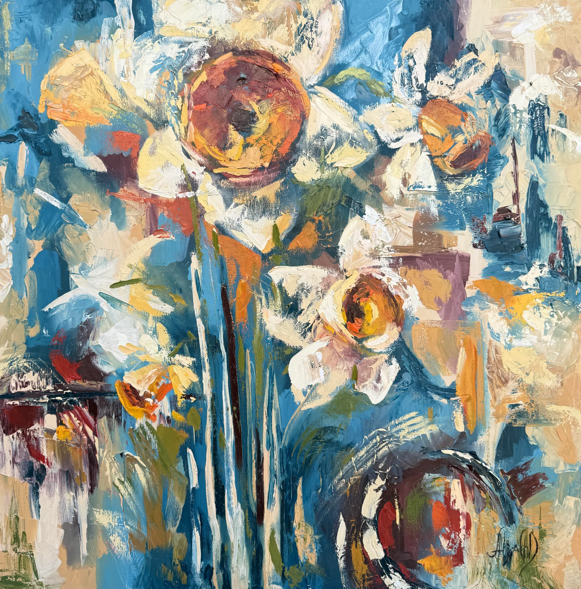 This oil painting on canvas is inspired by the season of blooming narcissus โ a time when they appear everywhere: in gardens, courtyards, and forests. During my walks, I observed these flowers in their natural surroundings, photographing them and absorbing their rhythm, form, and quiet presence. The narcissus are not depicted literally but emerge through color, movement, and textured layers. The work carries a sense of light, air, and the calm strength of nature unfolding in its own time. This painting is conceived as a gentle talisman โ a reminder of natural cycles, inner balance, and the deep connection between humans and the living world.