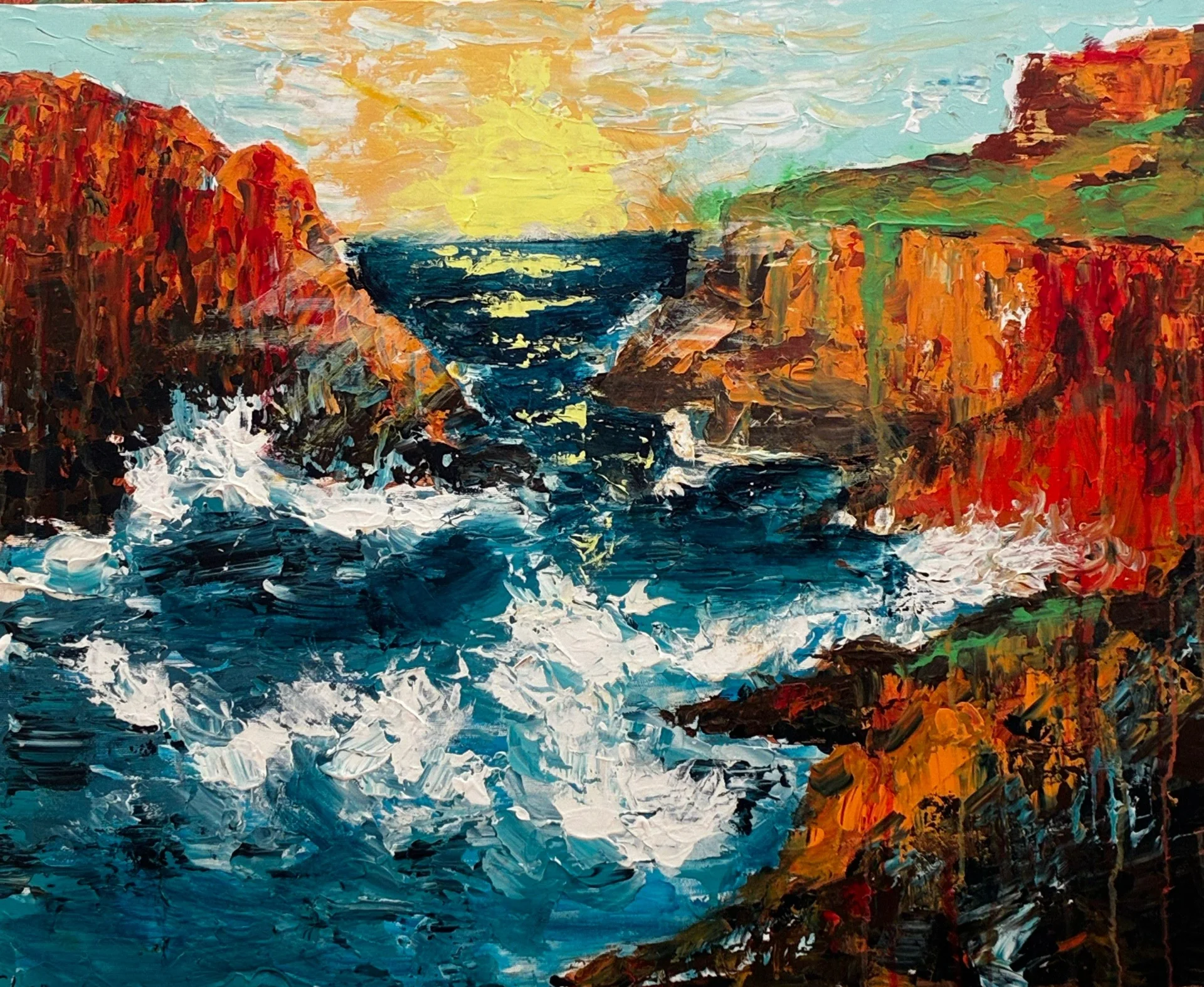In this acrylic painting, I captured a breathtaking seascape with cliffs. On the canvas, I aimed to depict the dramatic interaction between the majestic cliffs and the dynamic ocean waves. I used warm earthy tonesโred, orange, and brownโto convey the beauty of the cliffs, with hints of green vegetation on their tops. The dark blue and turquoise waters crash against the rocky shore, creating splashes of white foam that lend a sense of movement and dynamism to the piece. The sky transitions from soft pastel yellows to light blues, creating contrast and helping to convey a serene atmosphere. I was inspired to create this painting by the grandeur of nature and its ability to evoke emotions. I wanted to capture the power and beauty I felt while standing on the shore and gazing at this incomparably beautiful seascape.
