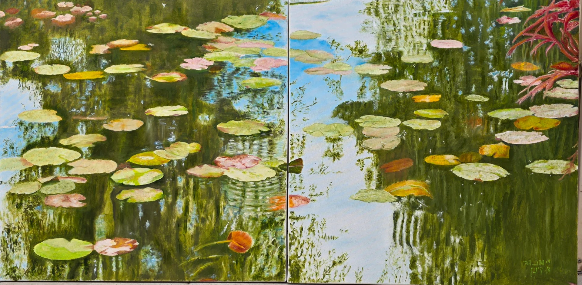 A double-panel oil painting (diptych), giving a contemporary interpretation to classic waterscapes, the painting captures a fleeting moment of light reflected on the surface of a deep pool, where floating lily pads dance between the colors of deep green and the clear blue of the sky.
