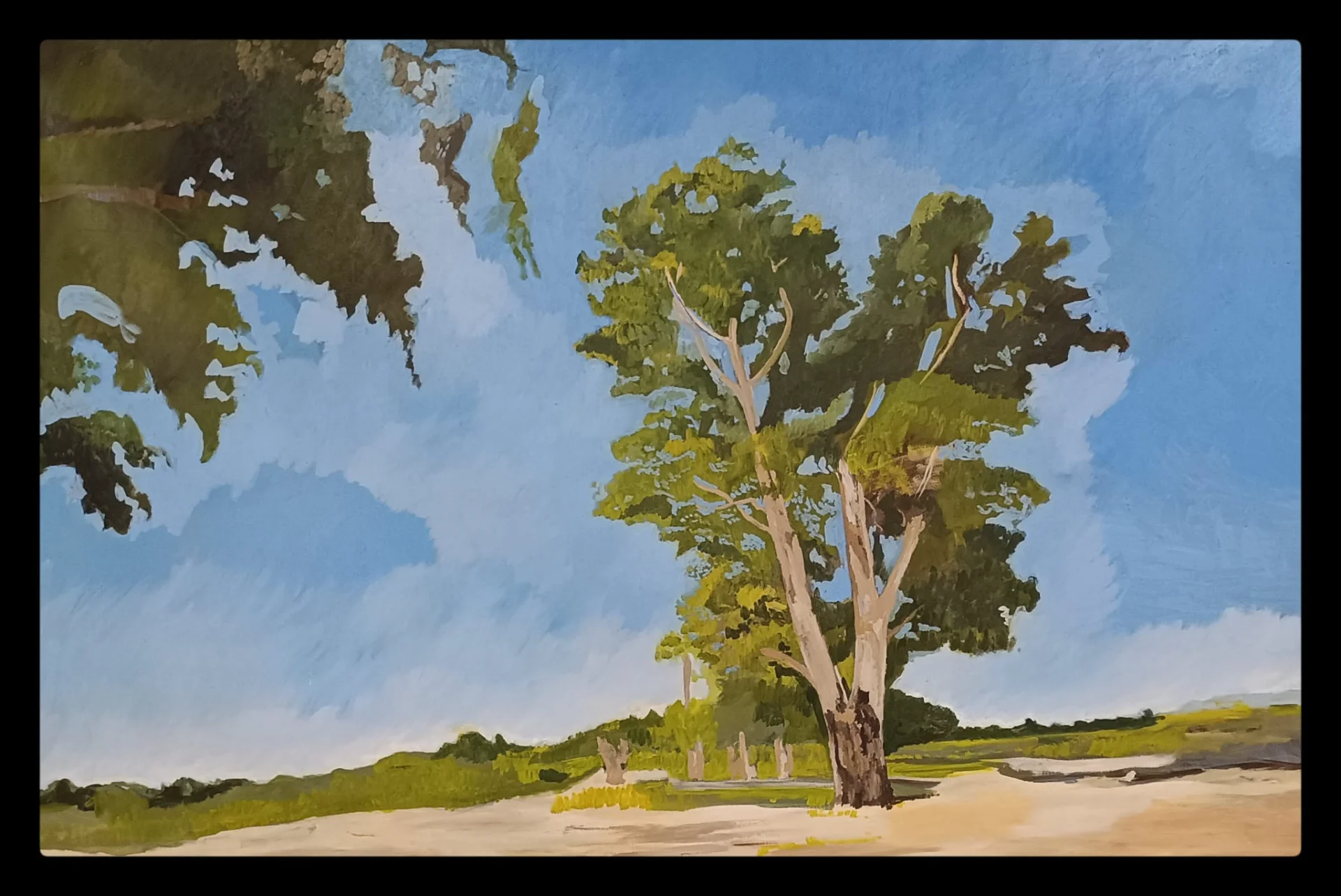 An Og eucalyptus tree stands in an open landscape, its branches moving gently in the wind as daylight washes the leaves in soft greens. The restrained scenery emphasizes a quiet presence, connecting earth, sky, and time.