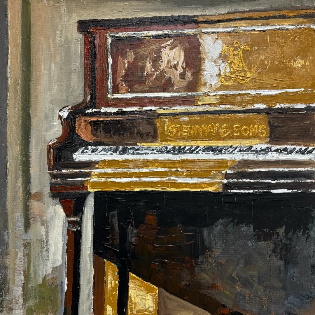 An expressive, textured painting of a vintage Steinway piano. Through layered brushwork and abstracted structure, the work evokes memory, intimacy, and the enduring presence of music.