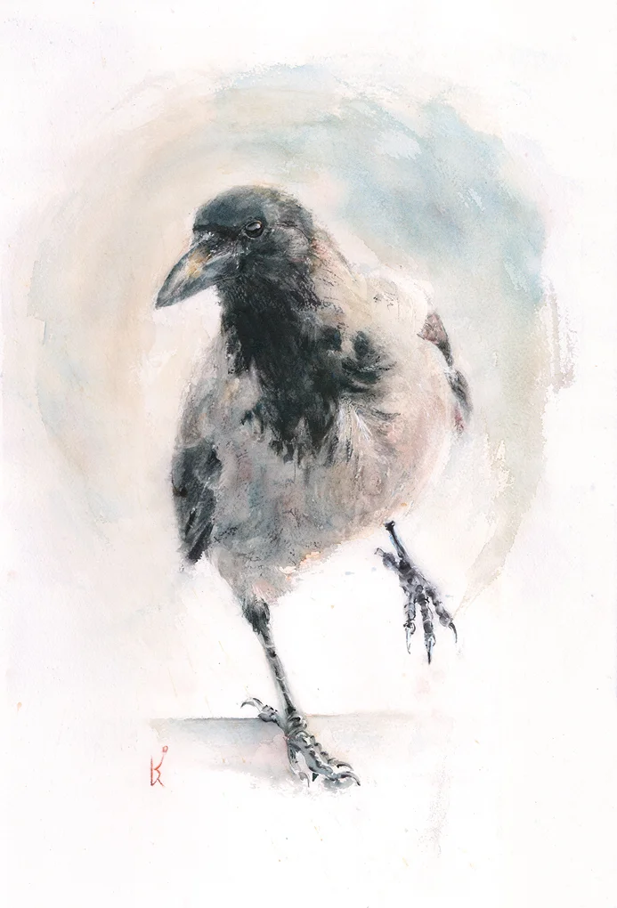 A lively and ironic portrait of a crow in the style of contemporary watercolor painting. This piece captures a moment of pure charisma: the artist combines meticulous detailโa piercing gaze and sharp talonsโwith a soft, almost ethereal "wet-on-wet" technique. The dynamic composition and restrained palette create an image full of dignity and subtle flair. It is more than just a portrait of a bird; it is a study of character and confidence. Paper: 100% cotton professional watercolor paper (Arches), 300 gsm, acid-free. Medium: Professional artist-grade watercolors (Daniel Smith). Authentication: Original work, hand-signed by the artist. Sold unframed