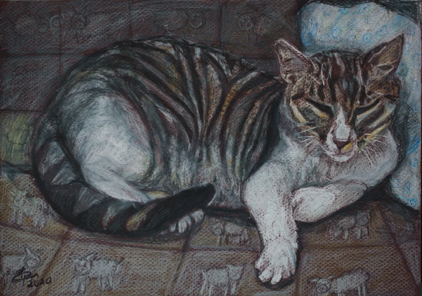 on the sofaמתוך הסדרה ימי קורונה: בין ארבעה קירות. בתקופה שבה היינו בבידוד ובסגר, בעקבות הפנדמיה, קבלתי השראה לציור מכל מה שנמצא סביבי בבית ומבעלי החיים שחלקו אתי את הבדידות. זהו ציור של החתולה שלי נאטאשה.