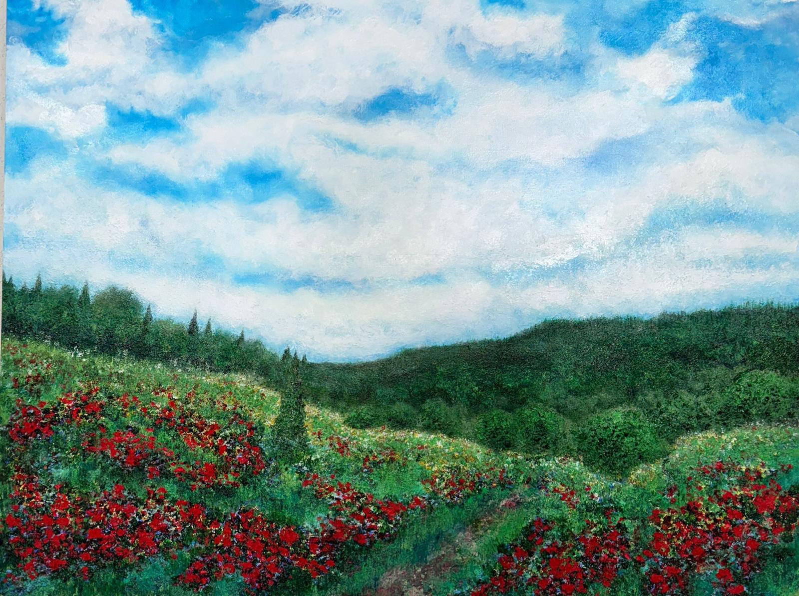 A gentle path winds through vibrant red poppies between rolling green hills beneath an open sky, capturing a moment of freedom and natural light.
