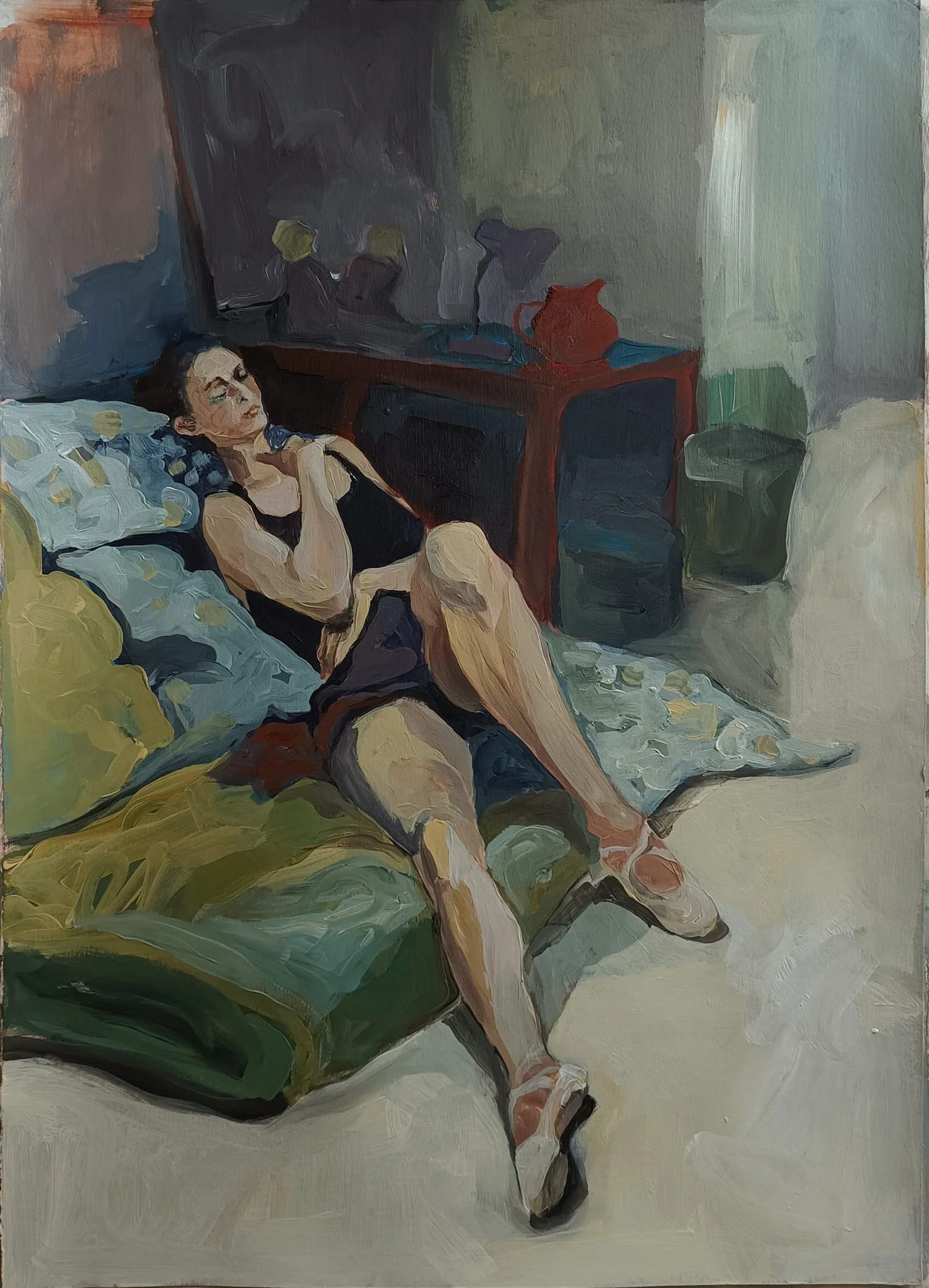 The painting depicts a resting dancer dressed in rehearsal clothes. Her state is not one of movement but of suspension โ a moment of recovery between exertions. The body retains the memory of work even while at rest. In the background stands a table with a simple still life composed of two dolls. These immobile figures echo the dancerโs body, sharpening the contrast between living presence and frozen form, between a temporary pause and complete stillness