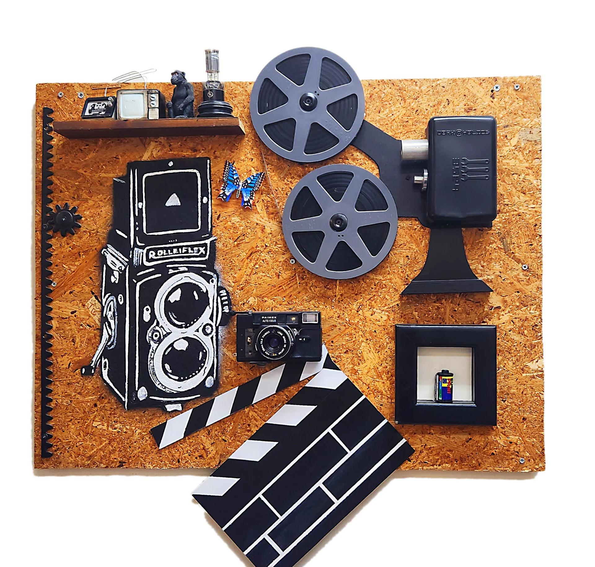 A collage made of various accessories + acrylic painting that together create a work of elements from the field of films and cinema. "To each his own film"..