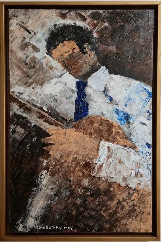 Original painting of a guitar player in an abstract technique with paint strokes using a spatula. The painting is one of a trio of musicians. You can add another player to create a set of paintings. The painting comes with a matching frame.