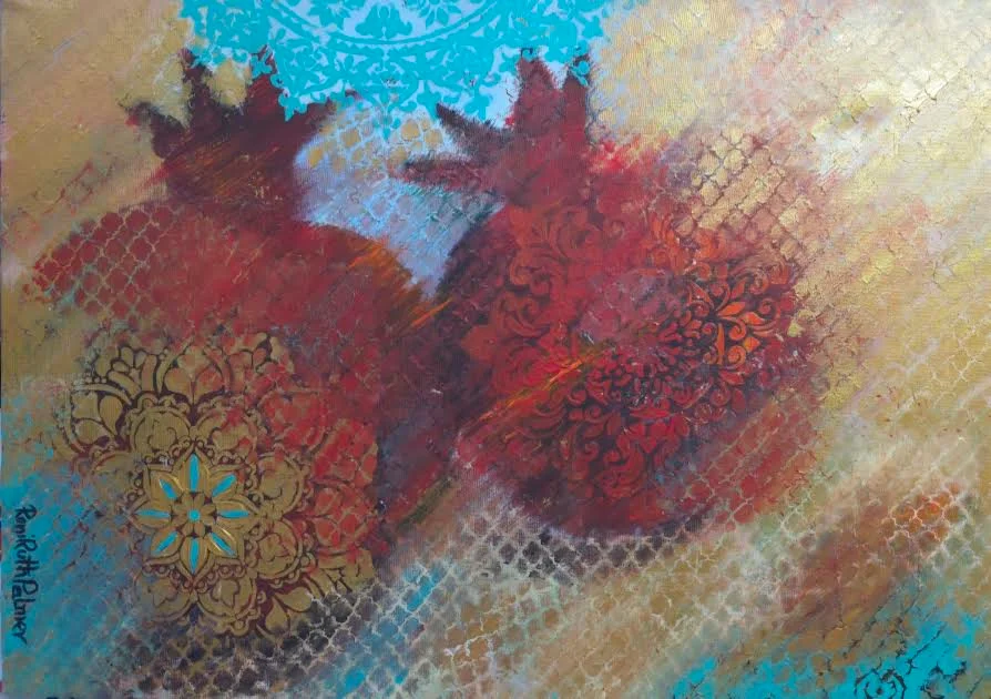 An original painting, presenting a rich, multi-layered abstract composition of two pomegranates. Warm colors of red, gold, and brown meet refreshing touches of turquoise and light blue. The surface is constructed of varied textures that resemble a mesh pattern, cracks, and memories of material, and over them are embossed ornamental motifs reminiscent of mandalas, lace, and decorative elements from the East and vintage. The pulsating center of the work creates a sense of emotional movement โ as if the colors are moving towards each other, colliding and merging, while creating depth and inner strength. The combination of free layering and symmetrical, ornate shapes creates a subtle tension between chaos and order, between intuition and control. This is a painting that evokes a sense of warmth, mystery, and spirituality, and invites the viewer to prolonged observation and personal interpretation โ each look reveals another detail, another layer, and another story.