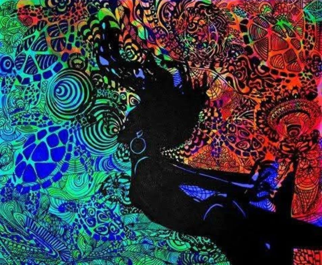 Deep Dive into the Infinite This piece invites the viewer on a journey of introspection and release. At its center is a woman’s figure, rendered in a deep black silhouette, representing inner stillness and a powerful presence within a loud and complex world. She isn't merely swimming; she is "diving" into the depths of consciousness. The space surrounding her is a psychedelic underwater realm, composed of countless geometric shapes, intricate patterns, and sea turtles that blend into the flow. The visual density and the explosion of color symbolize the emotional richness and vitality that can be found even in moments of uncertainty. The use of glow-in-the-dark (phosphorescent) pigments adds a transformative layer to the work: the light found within the darkness. When the lights go out, the painting shifts to reveal hidden dimensions—much like how art serves as an anchor and a source of healing during times of transition. This is a story of freedom, and of a woman’s ability to navigate through colorful chaos to find her own peace and beauty.