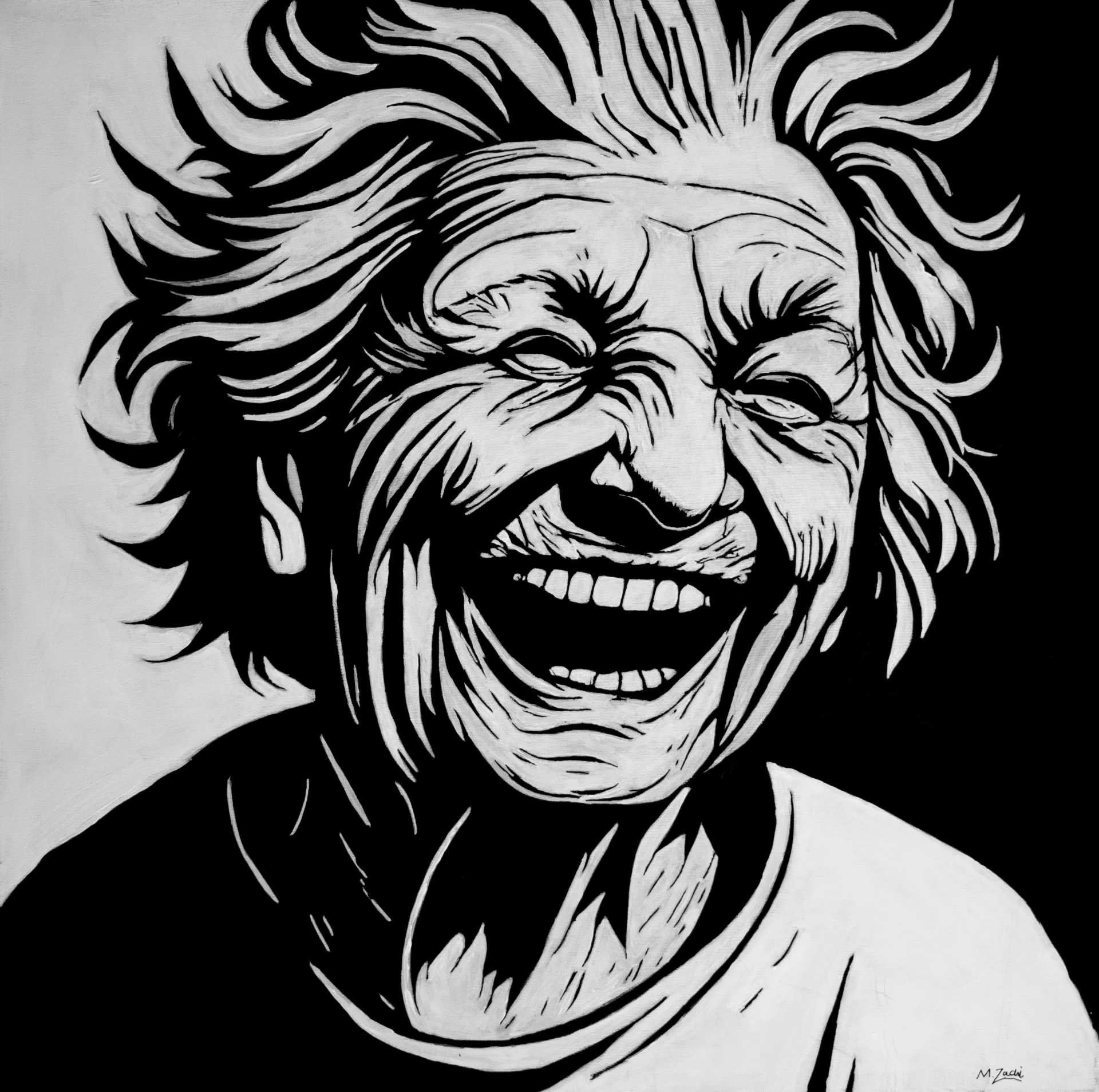 A black and white acrylic portrait capturing an explosive moment of laughter and freedom. The figure radiates raw joy, movement, and emotional release, expressed through bold contrast and expressive lines. A celebration of human spontaneity and the beauty of unfiltered emotion.