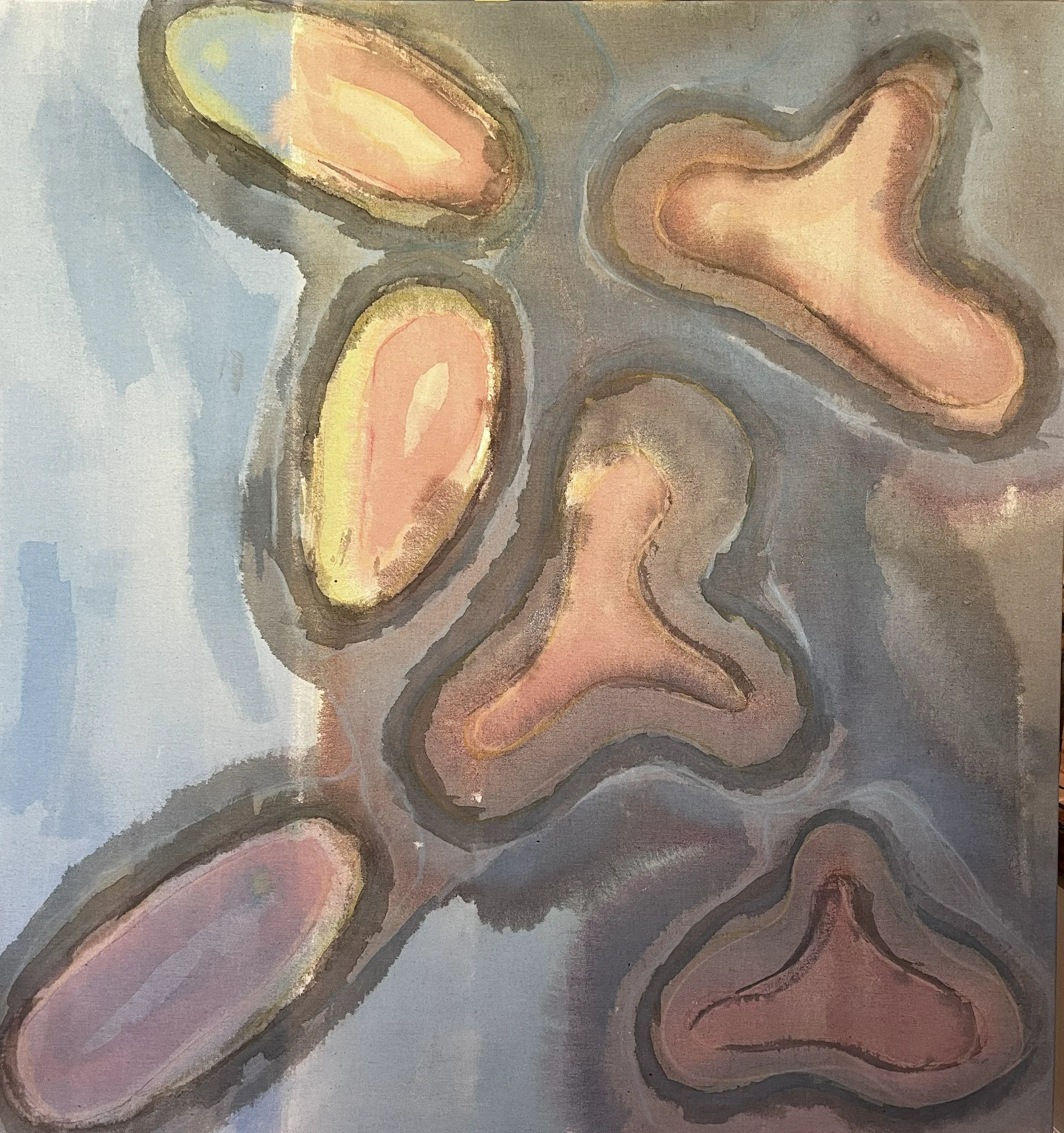A field of emerging, undefined forms, moving between appearance and disappearance. Layers of color breathe into one another, creating a sense of slowed time and soft materiality. Boundaries are blurred, and the forms exist as traces of inner movement—not objects, but states. The work invites stillness, listening, and a nonverbal reading of what unfolds between color, light, and space.