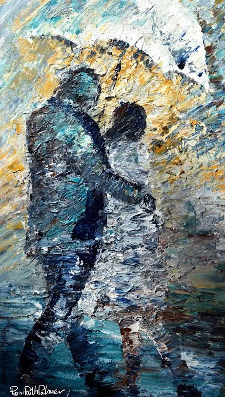 Original painting of a couple hugging in the rain under an umbrella. Abstract style painted with a spatula technique.