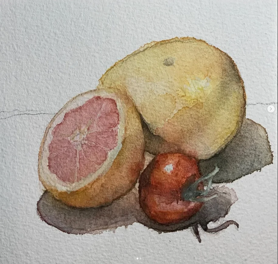 A watercolor study of citrus fruit arranged together with soft shadows and delicate detail.