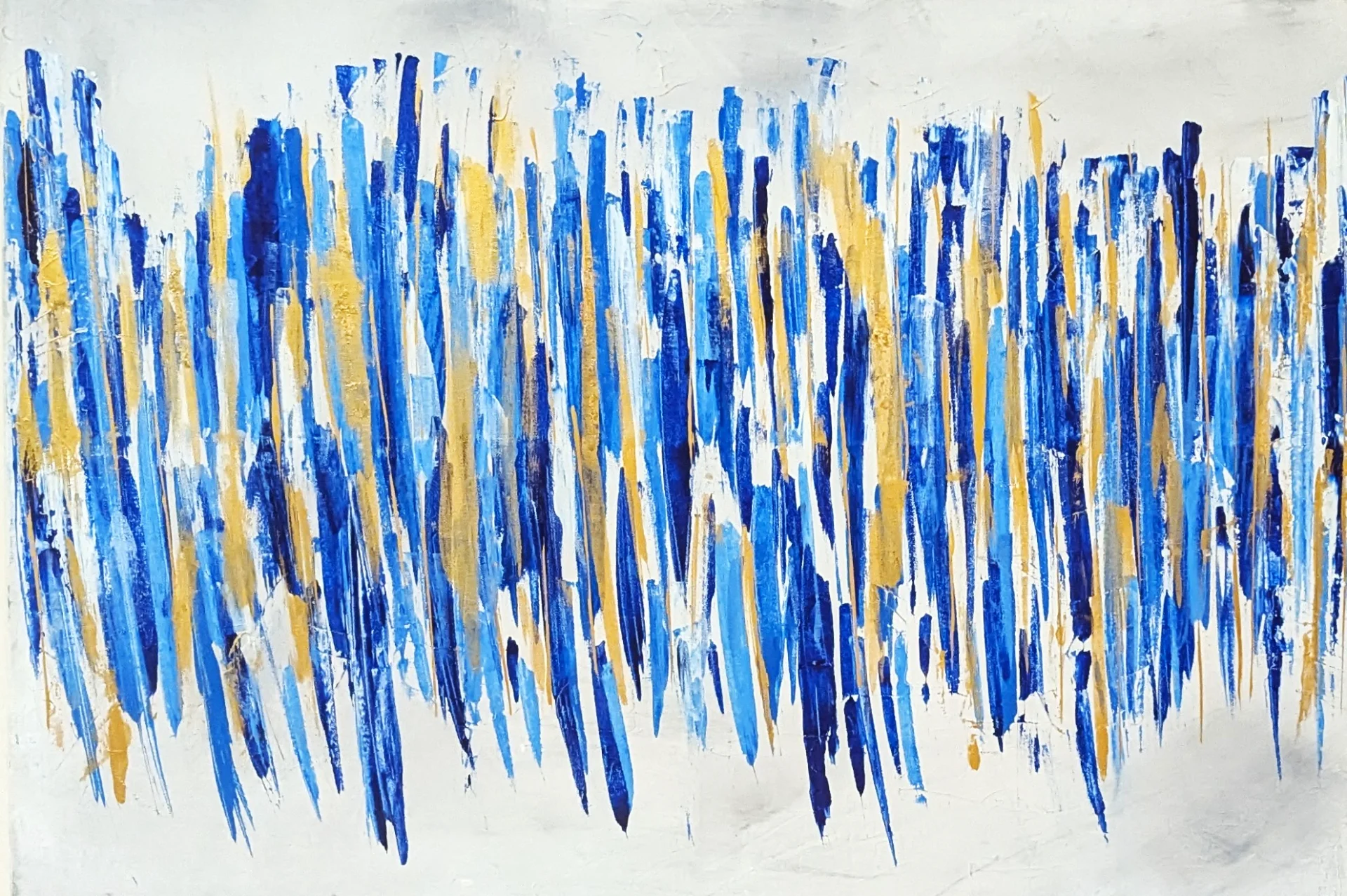 An abstract composition of layered vertical gestures in blue, white, and gold, exploring rhythm, movement, and the passage of time. Rich textures and dynamic brushwork create a sense of urban energy and emotional depth.
