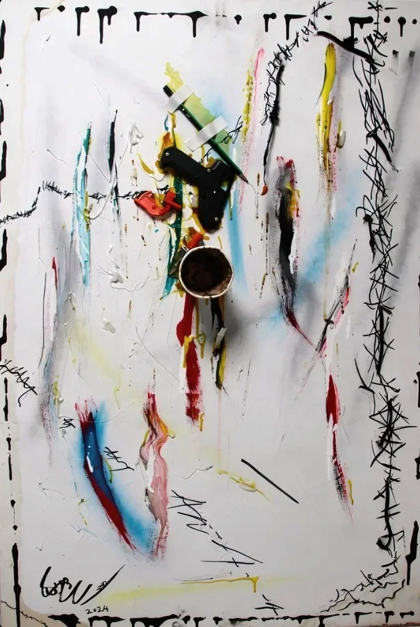 Title: Sacrifice Artist: Daniel Avraham Haddad Year of Creation: 2024 Dimensions: Width - 70 cm / Length - 1 meter Technique: Mixed Media – Acrylic on canvas, objects, coffee, cigarette. Work Description: "Sacrifice" is a mixed-media piece that explores the tension between destruction and creation. Against a stark white background—reminiscent of a space of silence or a "reset"—raw material elements erupt: a hot glue gun, a pencil, and material remnants that transform from functional tools into symbols of struggle and self-expression. The black lines, resembling barbed wire, and the red and yellow drips create a dialogue between confinement and emotional release, inviting the viewer to question the price of the creative process and the places where we sacrifice parts of ourselves to give birth to something new. The Artist’s Perspective: I chose the name "Sacrifice" because this work was created during a period when I sacrificed a great deal of my life to resolve past hardships. It followed a mission to Morocco and an earthquake that ignited so much within me, followed by a return to Israel just one week before October 7th. Between reserve duty, a journey of questioning my faith, and an overwhelming internal chaos I couldn't explain... I had to sacrifice a lot to reconnect with my inner essence. The hot glue gun attached to the canvas is the actual tool I used; the cardboard coffee cup is the one I drank from during the process, still containing coffee residue; and the cigarette’s smoke and ash were scattered across the canvas. Behind the work, there is an electrical connection for the glue gun that can actually heat up and eventually burn the painting—intensifying the meaning of "Sacrifice" as a deliberate choice.