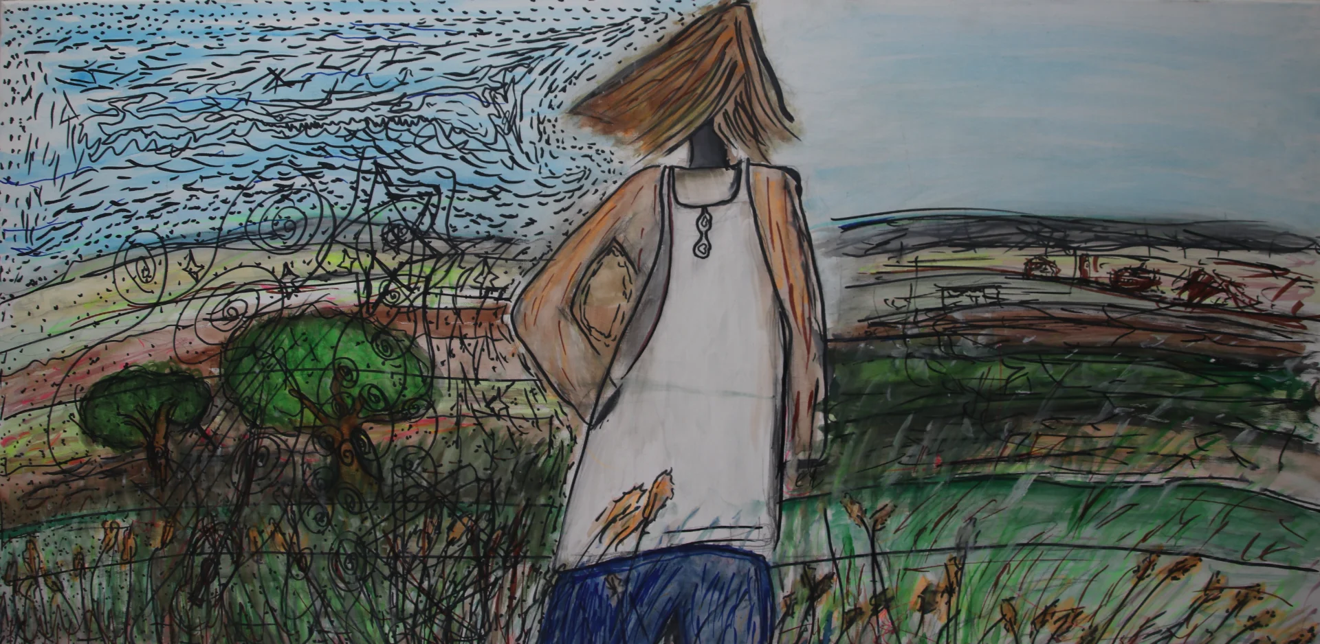 Artist: Daniel Avraham Hadad Technique: Marker and paint on canvas. Dimensions: Width 100 cm | Height 50 cm. Subject: A scarecrow figure in an open landscape. Work Description: The piece presents an emotional, panoramic view of a figure standing with its back to the viewer, gazing toward a wide horizon, while combining sharp graphic lines with free-flowing brushstrokes. Key Elements in the Painting: The Central Figure: At the center of the composition stands a scarecrow figure dressed in white, its hair blowing in the wind, which lends dynamism to the painting. The Landscape and Horizon: The painting is divided into two visual worlds. The right side is characterized by quiet, horizontal lines of fields and hills in earth and green tones, while the left side is more turbulent, with circular and spiral black marker lines simulating wind, wild vegetation, or the energetic movement of nature. The Sky and Light: The sky in the upper portion is bright and clear, creating a strong contrast with the complex lines of the ground and vegetation in the lower part. Summary and Style: The work combines an expressive style with free graphic sketching. It manages to capture a fleeting moment of wind and movement within a rural landscape, leaving an impression of serenity mingled with inner strength.