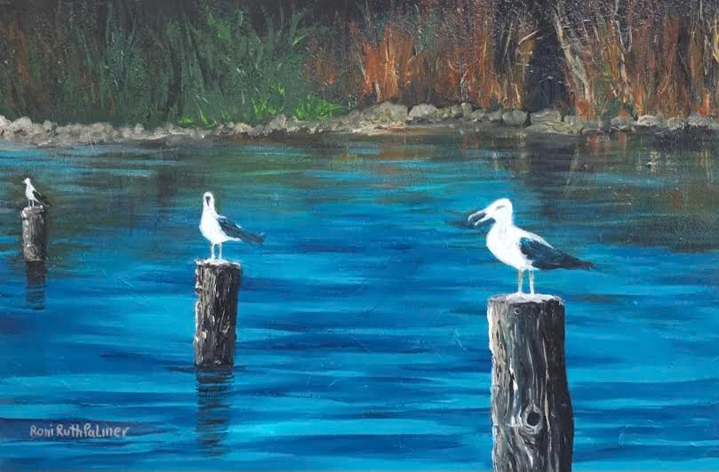 Original painting of seagulls on a lake. Inspired by a boat trip in Canada and a photograph of seagulls on a lake.