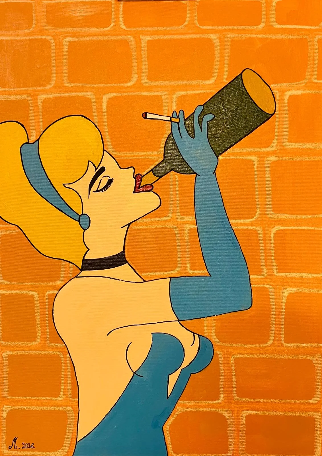 Sip Happens reimagines a familiar fairytale figure through a bold pop art lens, blending clean graphic lines with a playful yet subversive twist. By placing the character in a contemporary, unapologetic moment, the work challenges traditional narratives of perfection and femininity. The contrast between nostalgic imagery and modern behavior creates a striking tension—both humorous and provocative. With its vibrant palette and confident composition, the piece celebrates freedom, imperfection, and the evolving identity of iconic figures in today’s world.