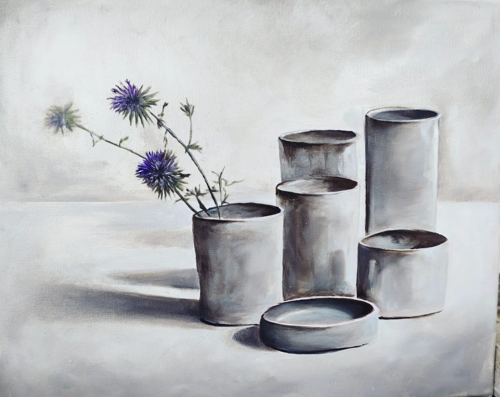 A delicate and restrained still life, composed of five cylindrical ceramic vessels and a shallow bowl placed in the foreground. The vessels, varying in height, are arranged in a graduated rhythm that creates a quiet, meditative movement within the space. Their palette is monochromatic—smoky grays, earthy browns, and subtle bluish undertones—emphasizing the materiality of the clay and the traces of firing and glaze, like marks of time on their surfaces. From the vessel on the left, slender stems of purple-blue thistles emerge, introducing an element that is at once wild and fragile. This contrast between the solid, restrained ceramics and the organic, slightly thorned vitality of the flowers generates a poetic tension: a dialogue between nature and craftsmanship, between softness and restraint. Soft light pours in from the left, casting elongated shadows that accentuate the volume of the cylinders and the space between them. The clean, luminous background allows the viewer to focus on the subtle tonal transitions and nuanced textures. It is a painting that invites slow contemplation—an exploration of material, stillness, and the quiet beauty found in precise simplicity.