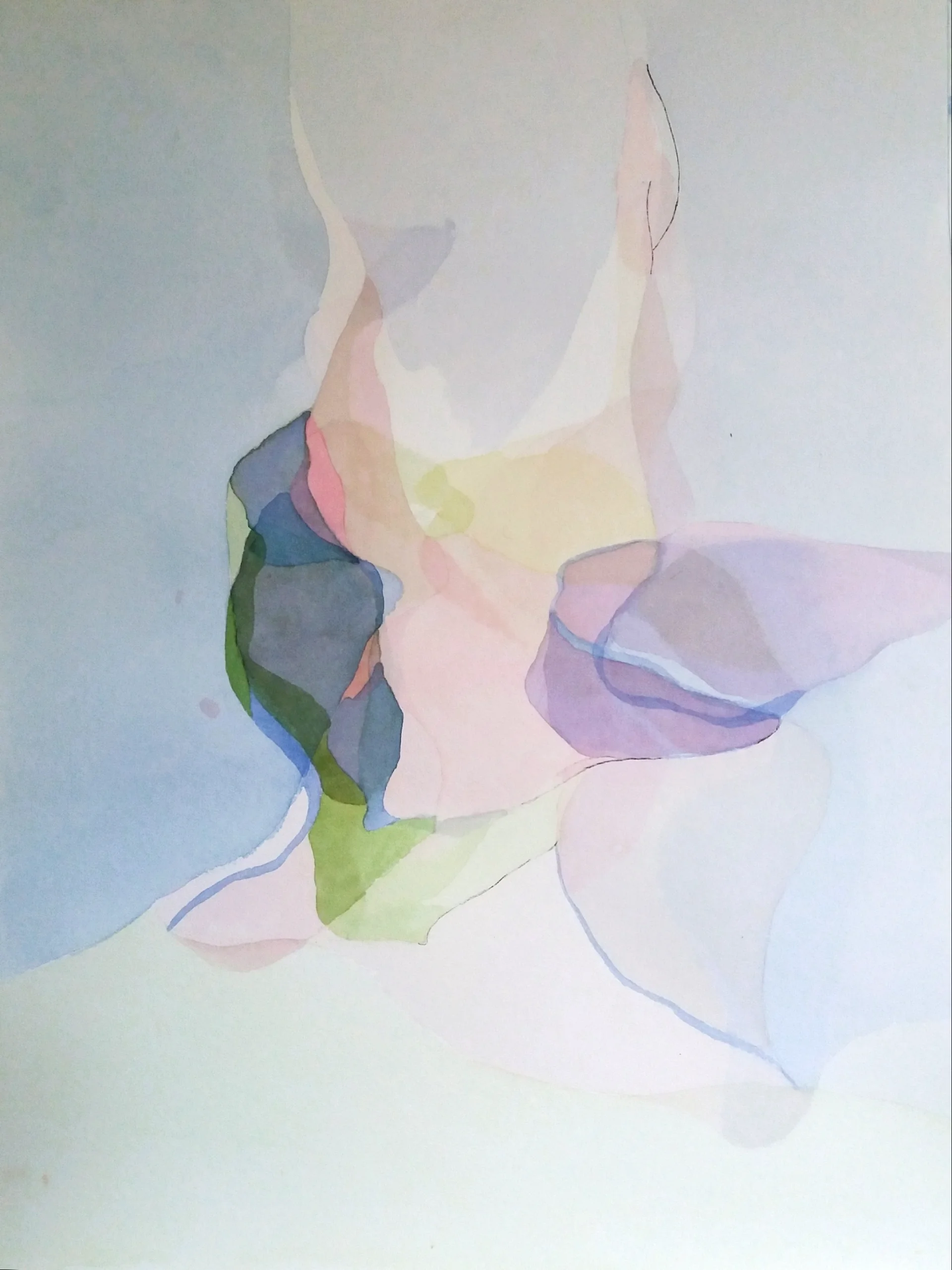 A delicate abstract portrait inspired by the atmosphere of spring, built from translucent layers of color, light, and shadow. Soft pastel tones and fluid contours create an airy, contemplative presence that hovers between figuration and abstraction. 2020