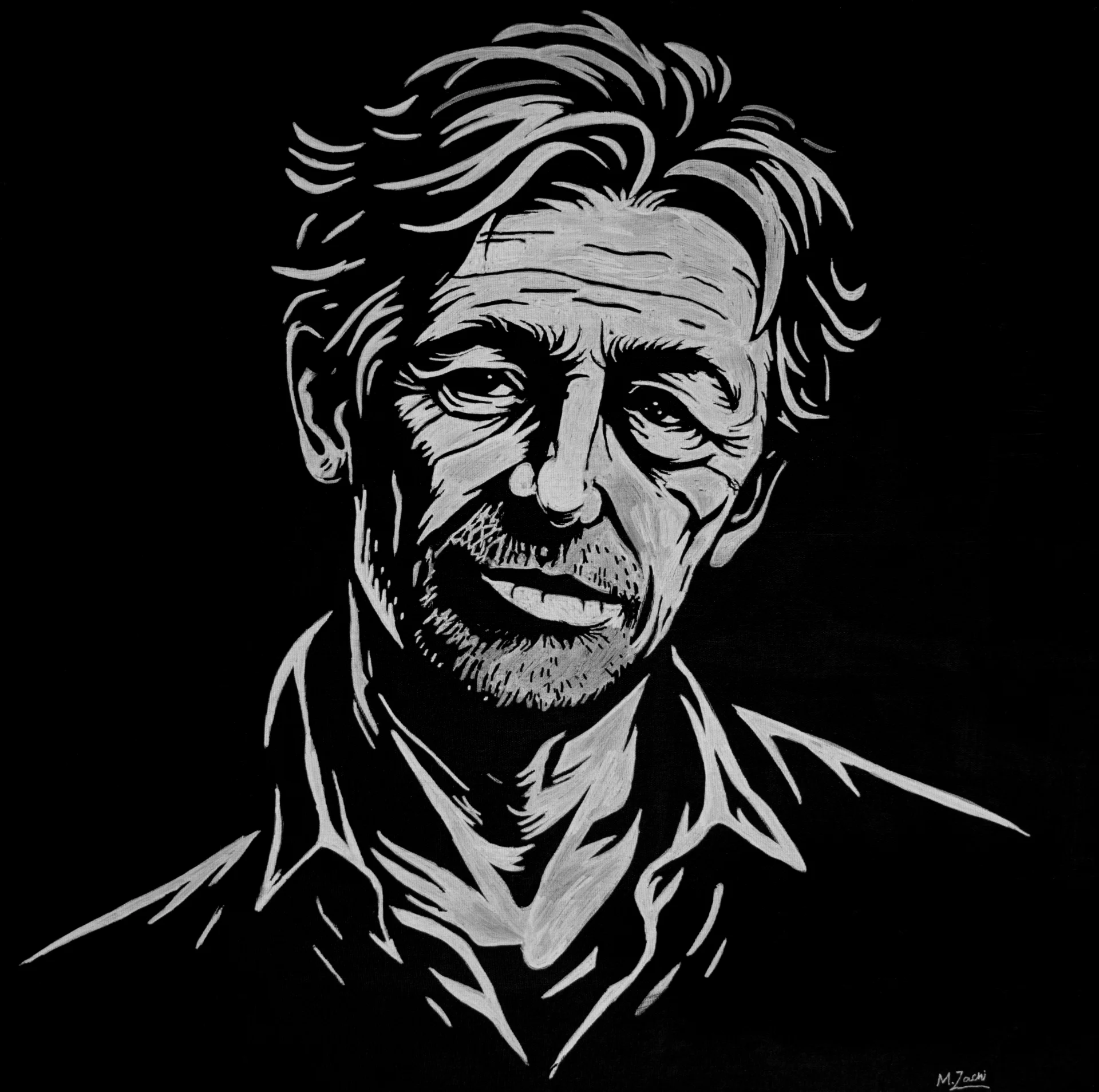 A black and white acrylic portrait reflecting endurance, memory, and quiet resilience. The restrained expression and steady gaze suggest a life shaped by experience rather than spectacle. Through stark contrast and minimal color, the work honors presence, survival, and the weight of time.