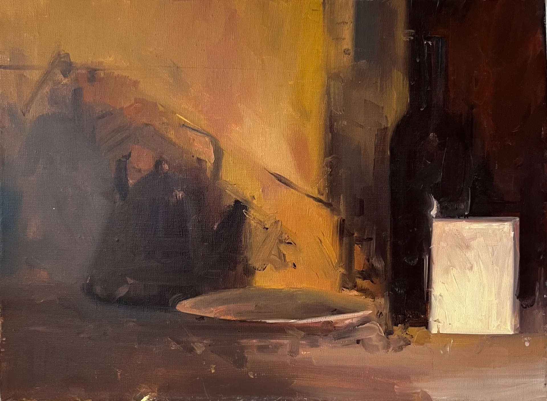 A tonal still life where forms almost dissolve into shifting light and shadows.