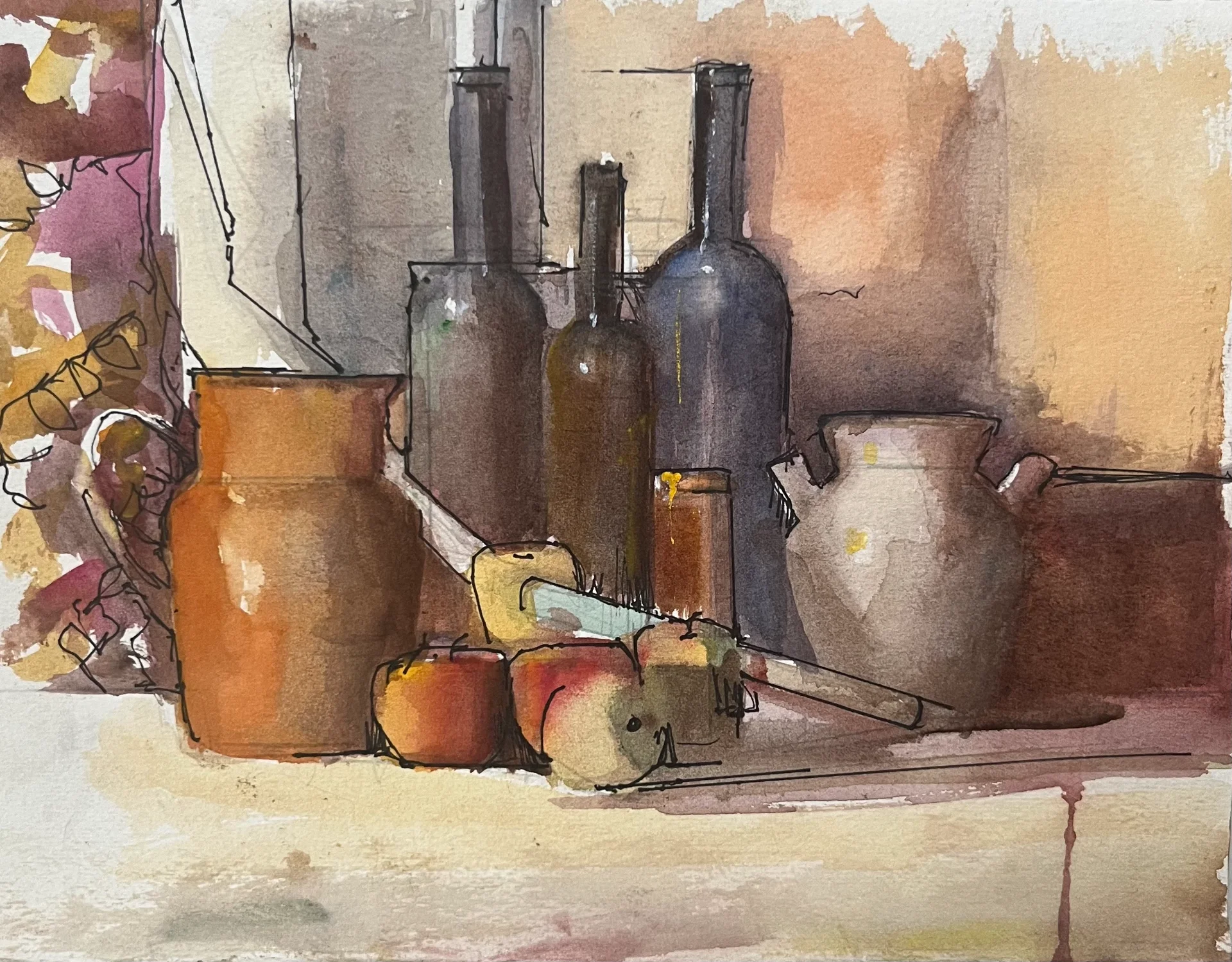 Cheerful watercolor of wine bottles, a pitcher, fruit, and a knife.