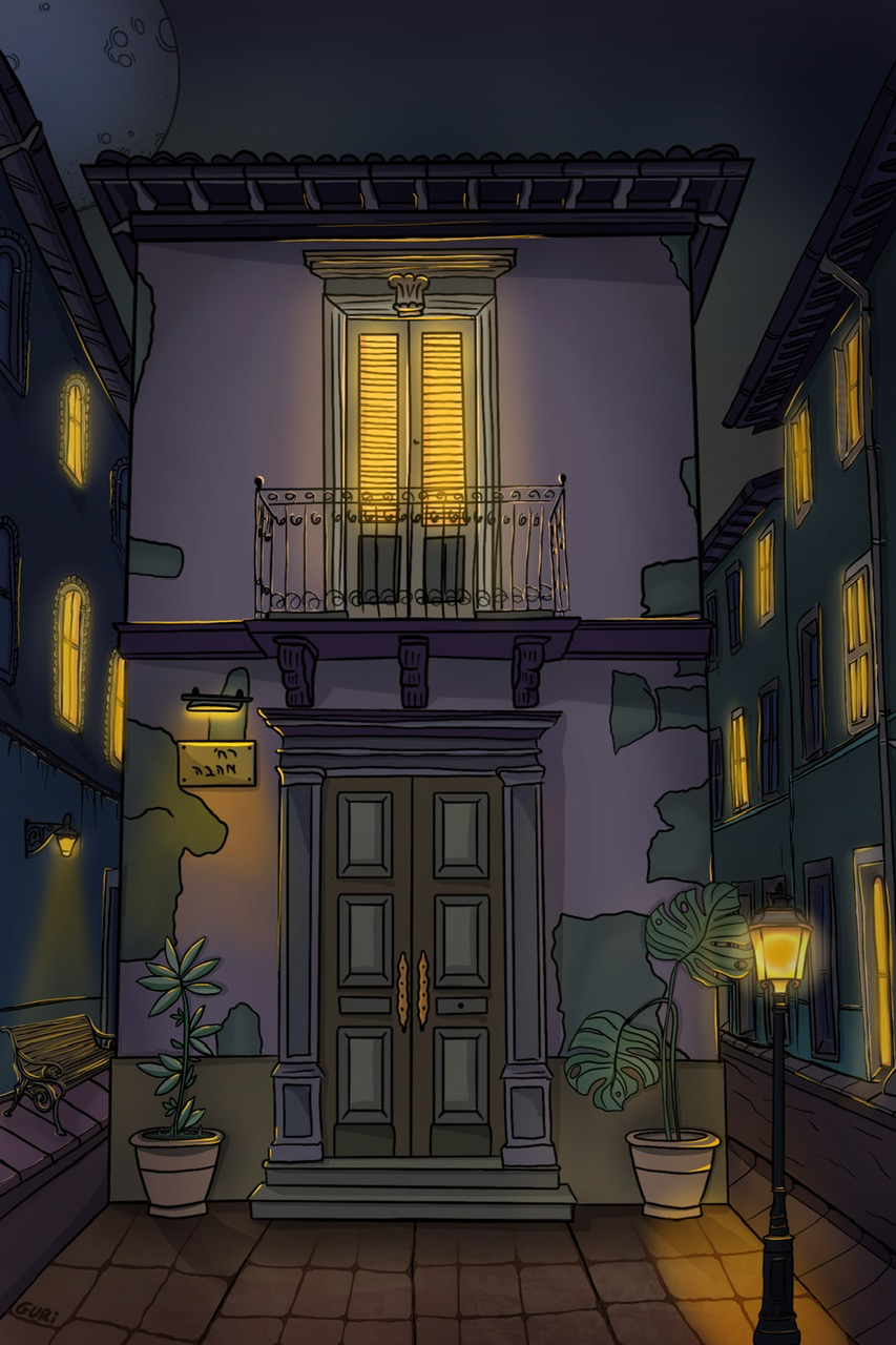 Warm lights glowing from the windows turn the street and its buildings into an image of comfort and longing. Behind a closed door, hiding an untold story, the artwork invites you to pause for a moment and remember that home is not just a structure – but a beating heart.
